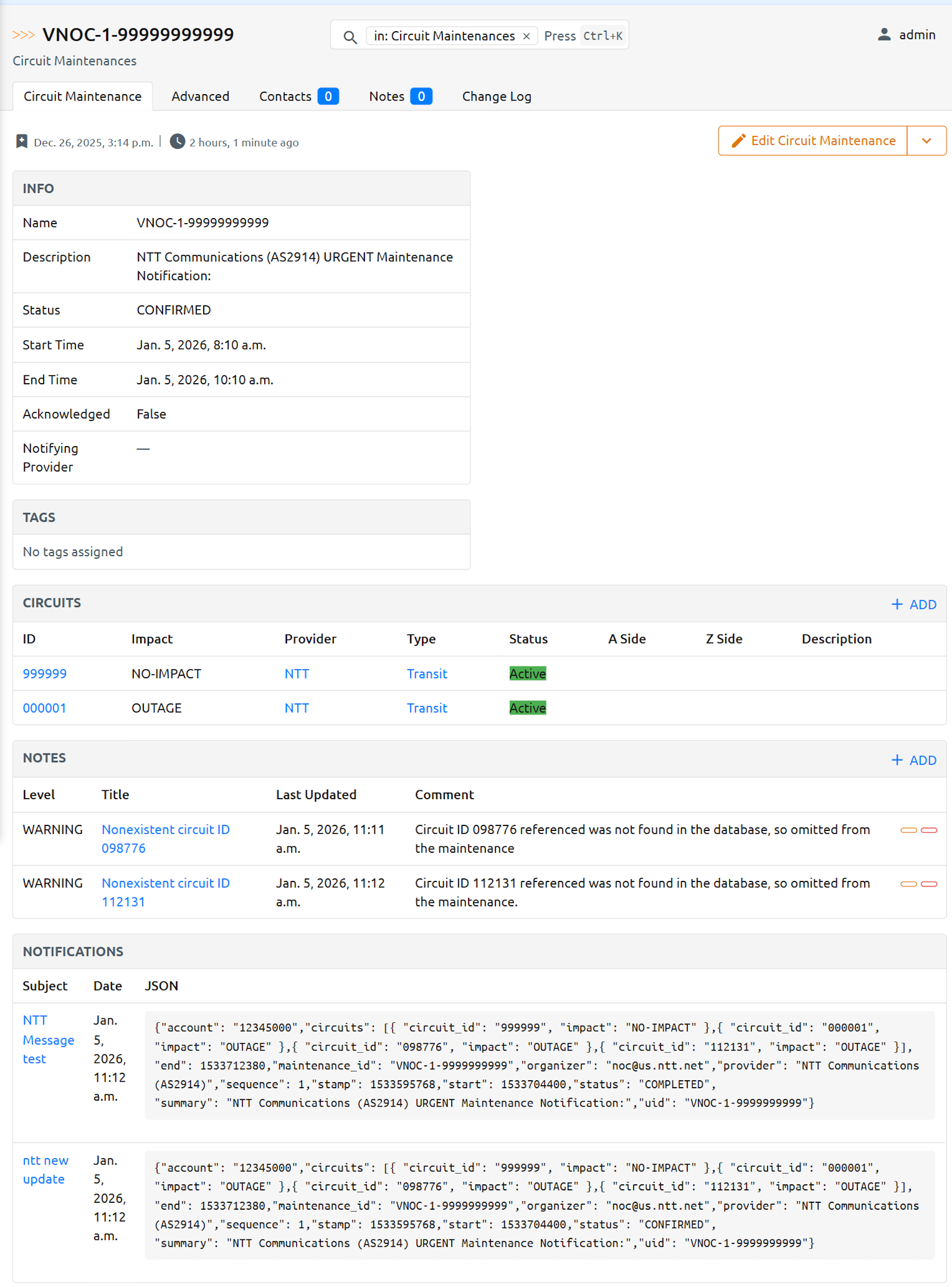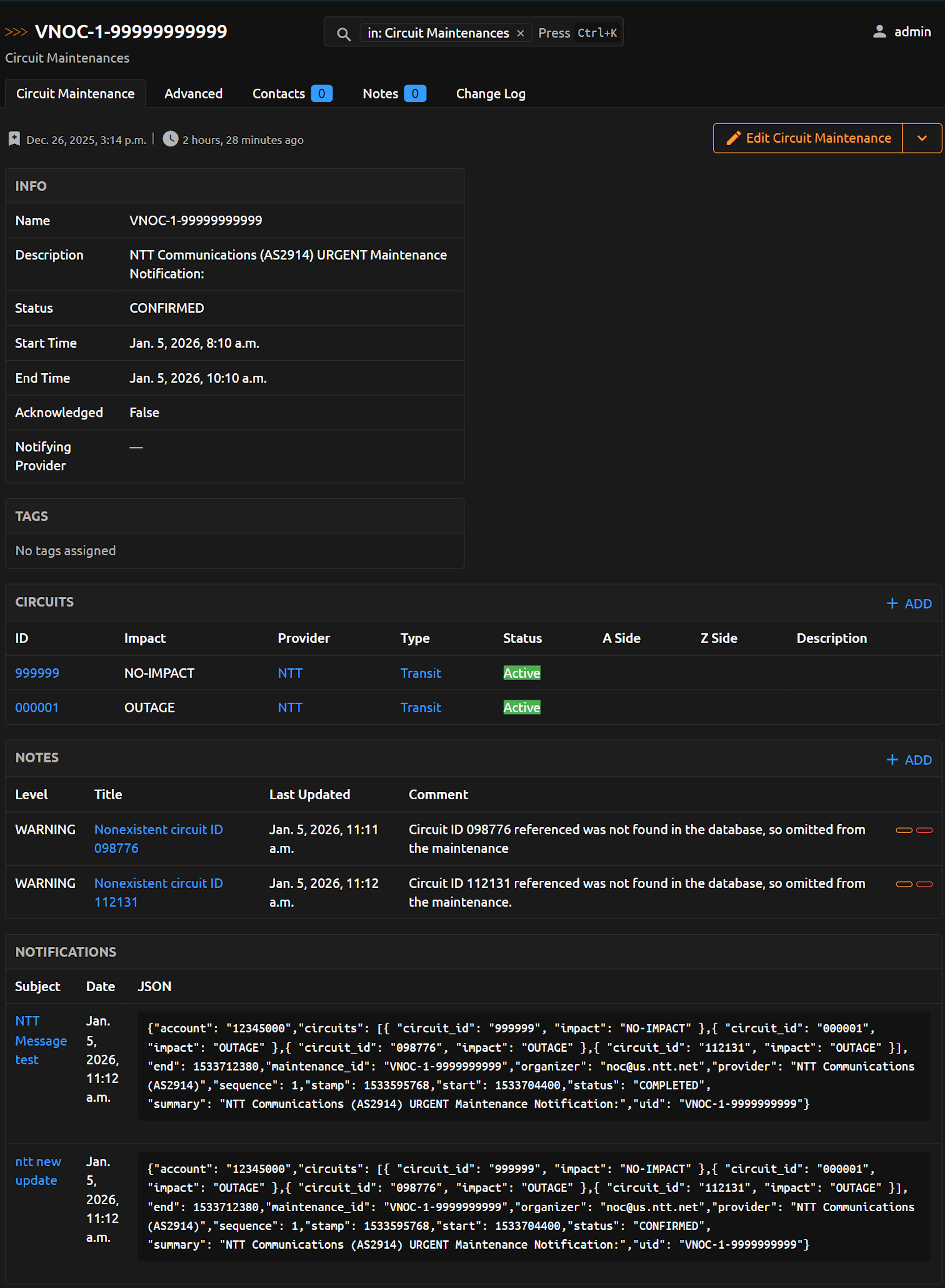 Each notification received will create a related object, containing the raw data received, and linking to the corresponding parsed notification in case the circuit-maintenance-parser was able to parse it correctly.