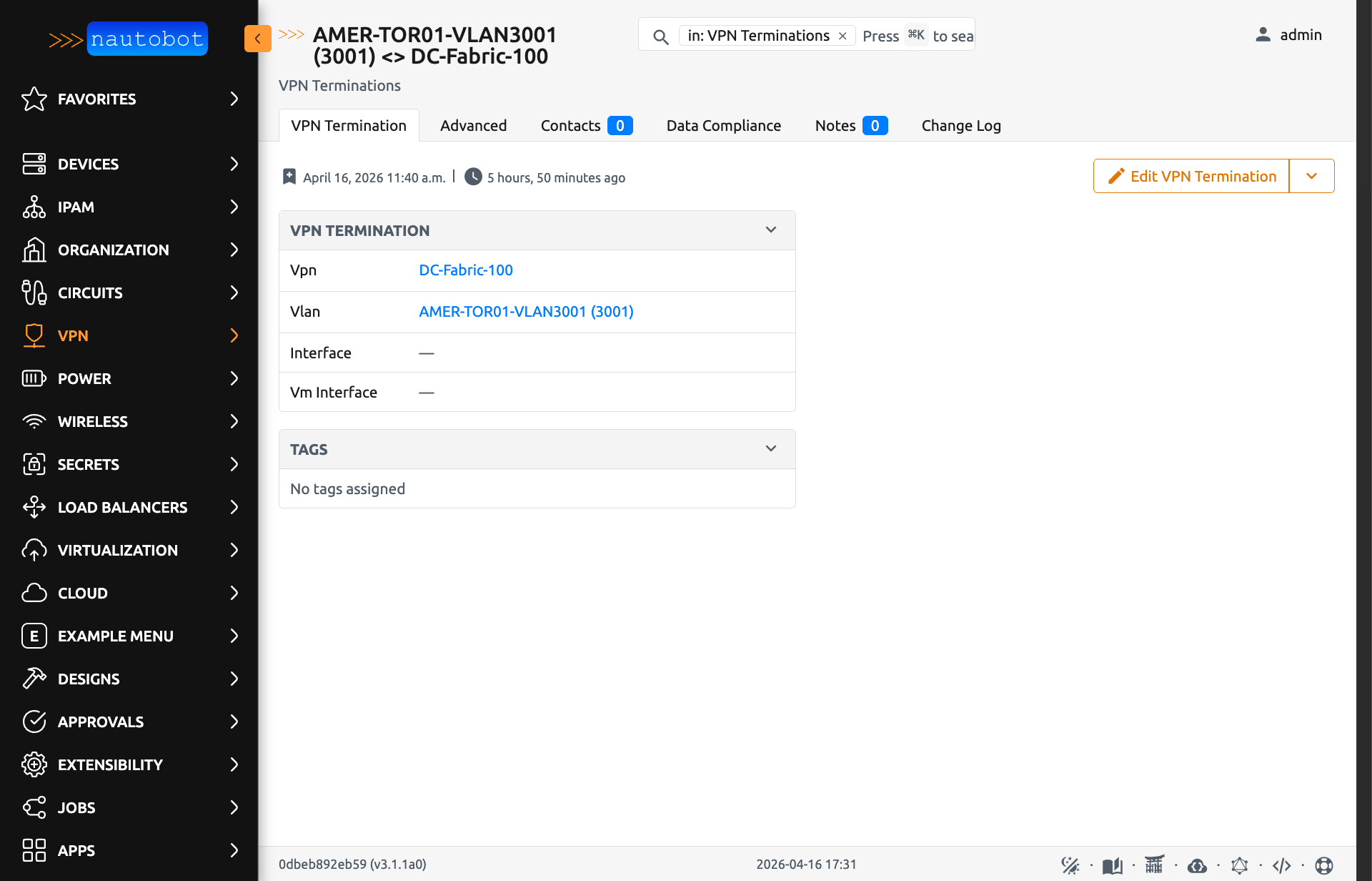 VPN Termination data is accessible from the following locations in the Nautobot UI: