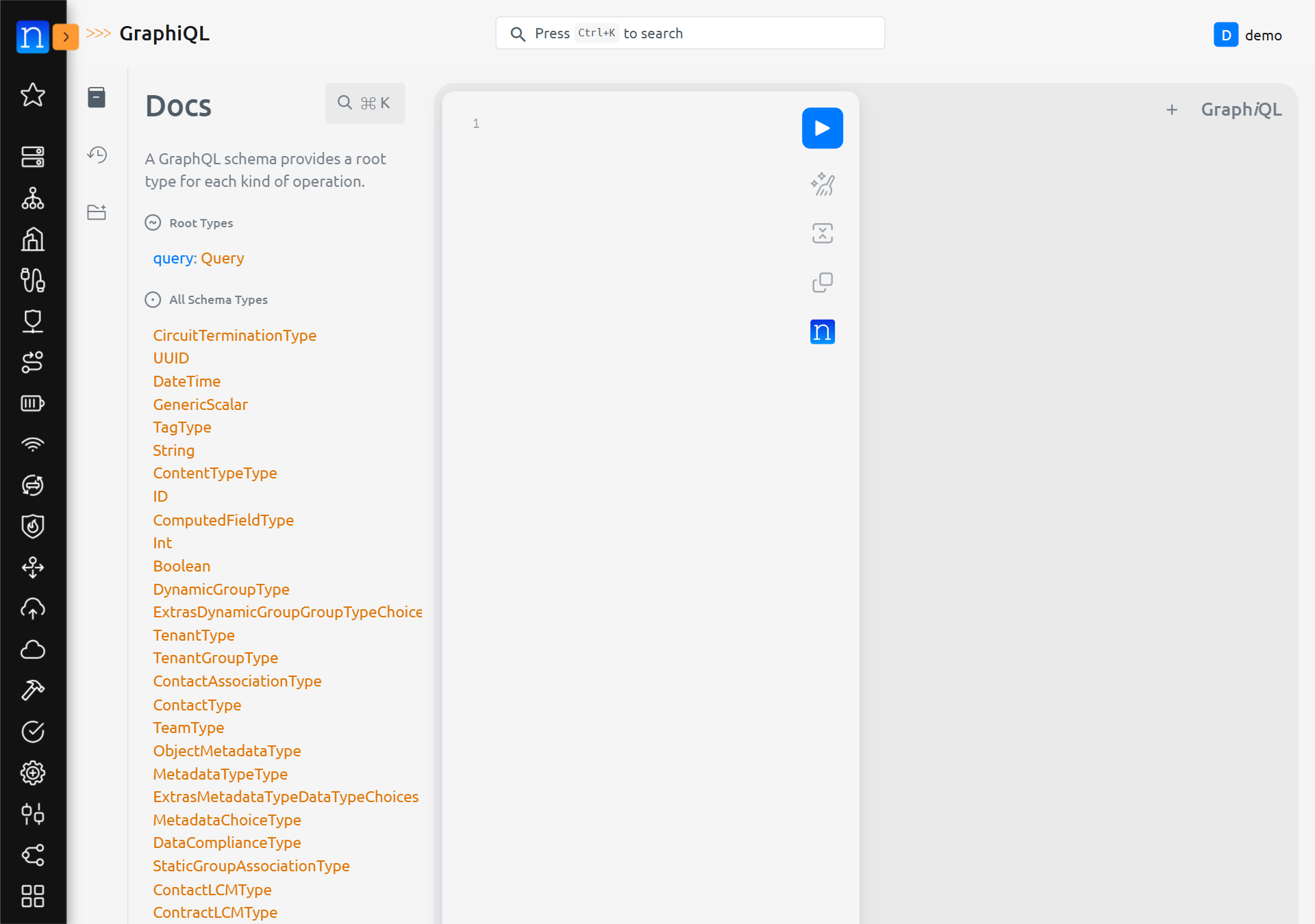 If you're new to GraphQL, take a little bit of time to explore the Documentation Explorer. This can be accomplished by clicking the < Docs link in the GraphiQL interface. The information within Documentation Explorer is specific to creating queries in Nautobot.