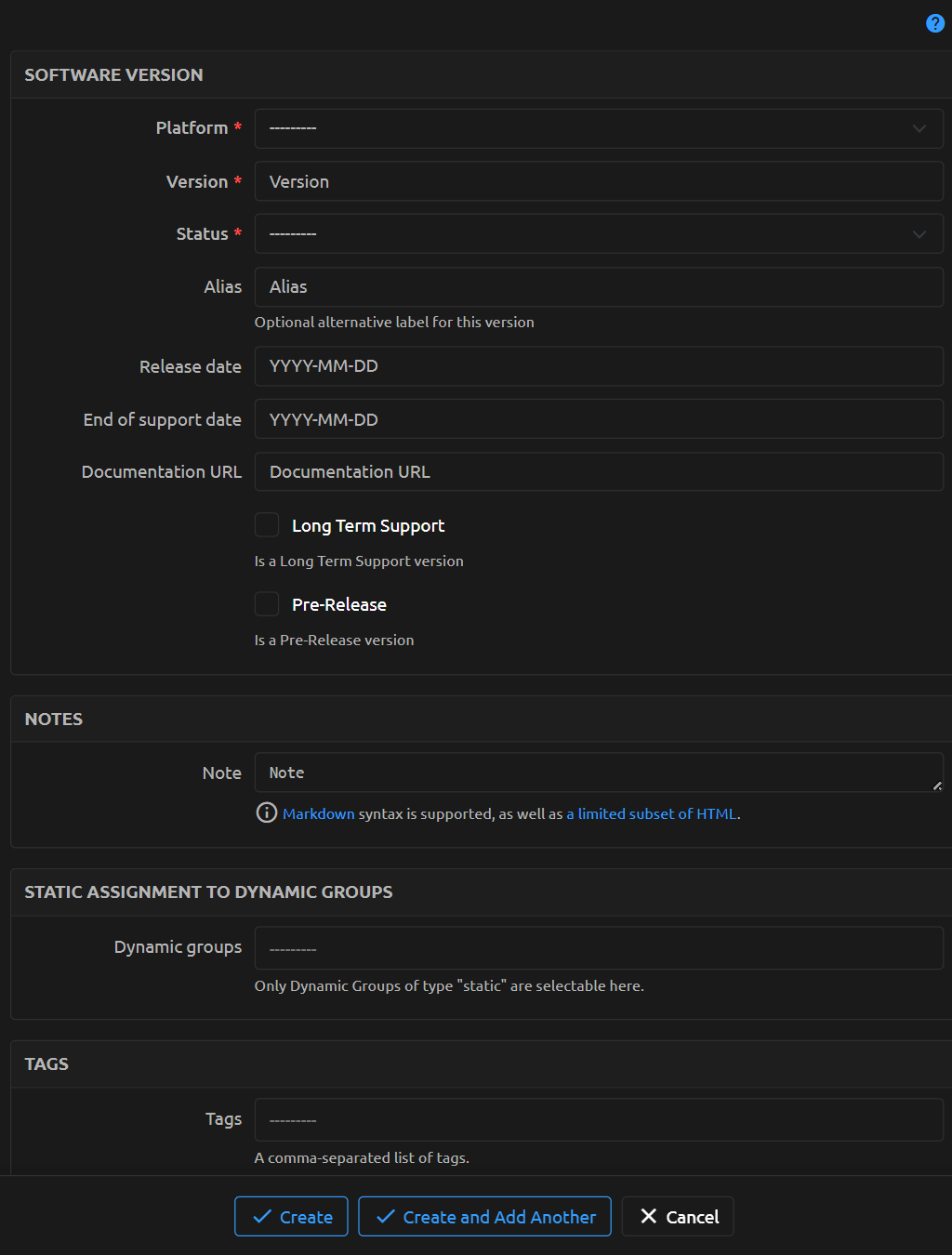 To create a new Software Version, navigate to Devices > Software Versions and click Add. (/dcim/software-versions/add/) The Platform, Version and Status fields are all required. You can use the Alias field if you would like to add a friendly name for the Software Version. There are optional fields for Release Date, End of Support Date, Documentation URL and booleans for Long Term Support and Pre-Release.