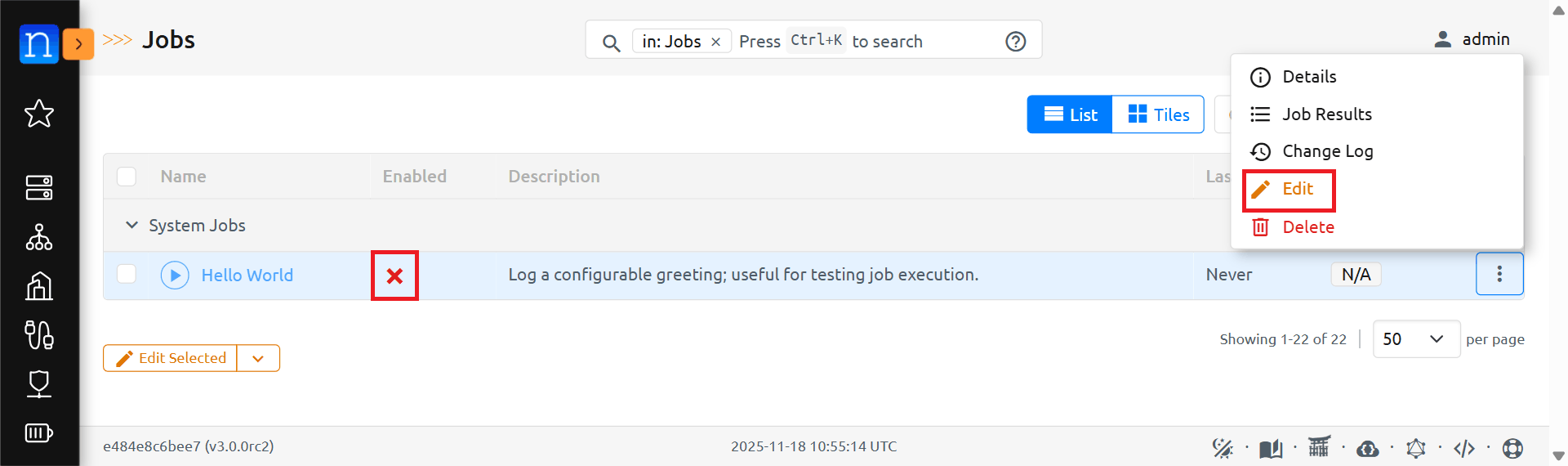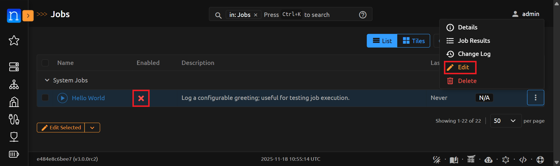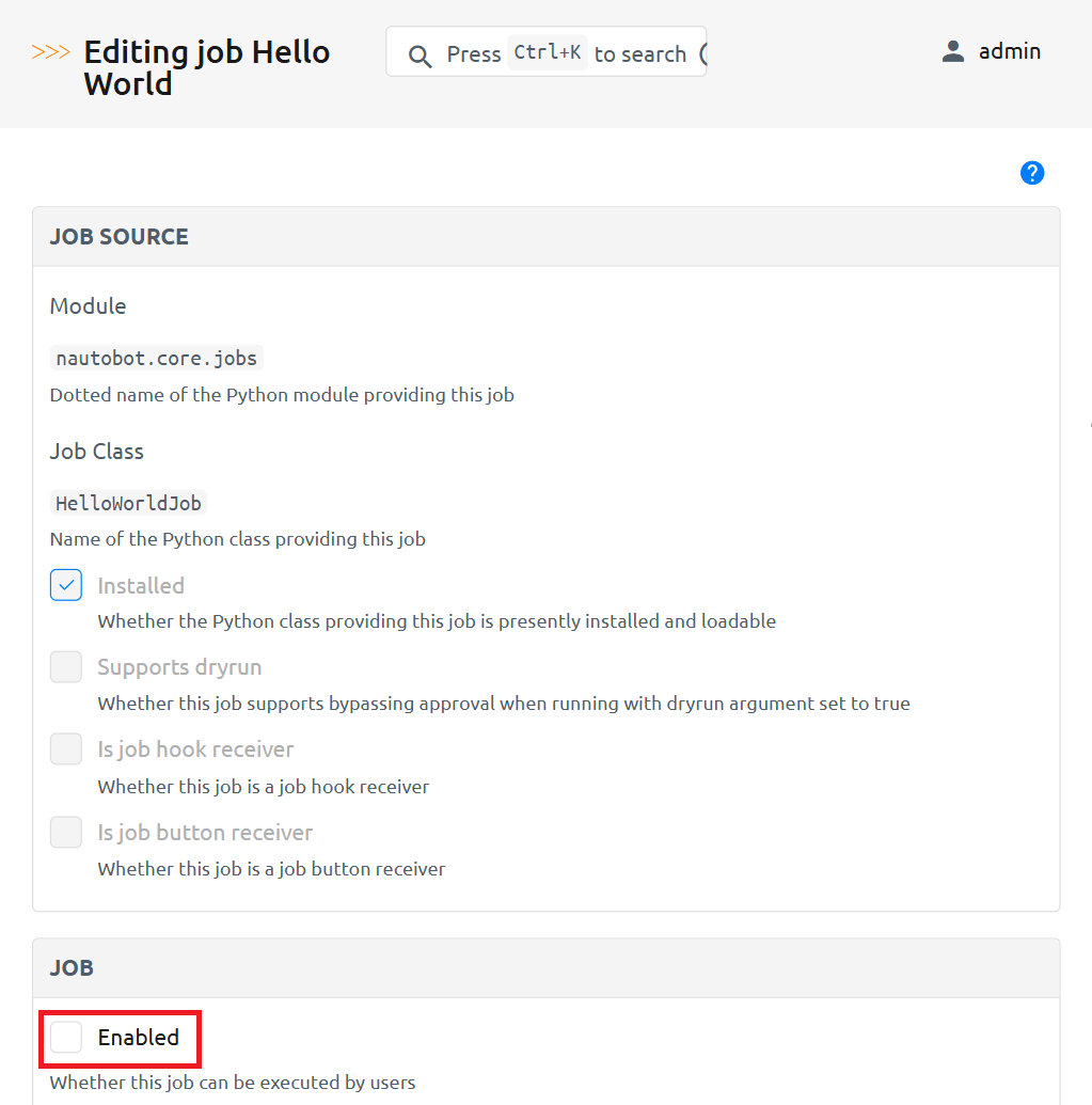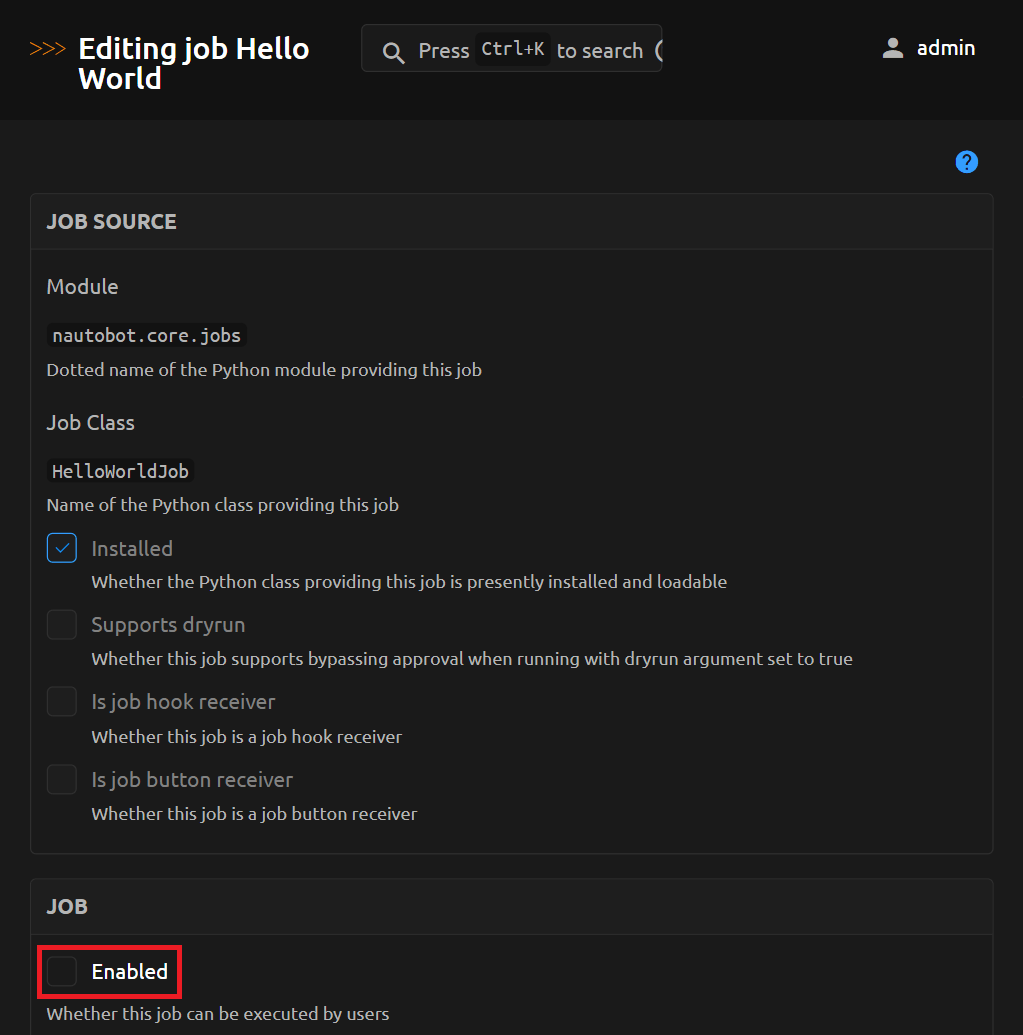 nautobot-server post_upgradeso Nautobot discovers the new Job and creates its database record. - In the UI, navigate to Jobs → "Examples" → "Hello World", click Edit Job, then under the Job section, select the Enabled checkbox. Scroll down and Update the job.
