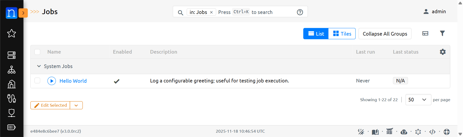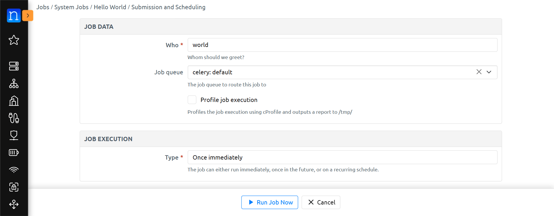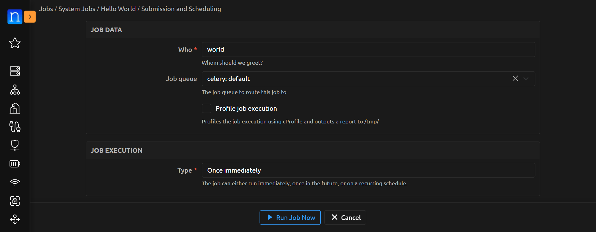 nautobot-server post_upgradeso Nautobot discovers the new Job and creates its database record. - In the UI, navigate to Jobs → "Examples" → "Hello World", click Edit Job, then under the Job section, select the Enabled checkbox. Scroll down and Update the job.