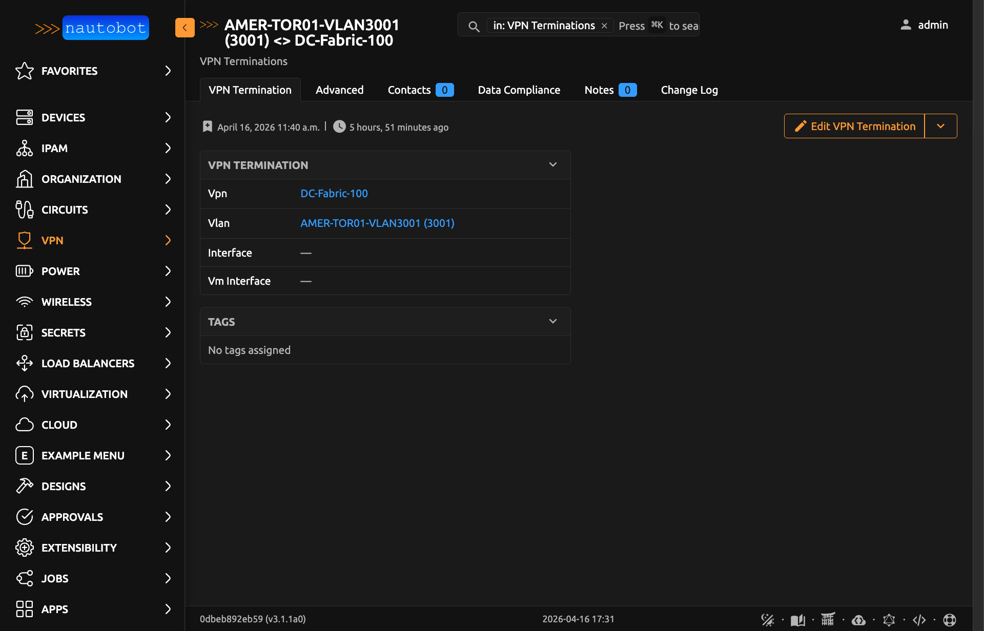 VPN Termination data is accessible from the following locations in the Nautobot UI: