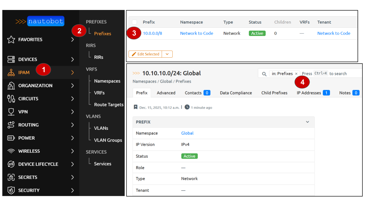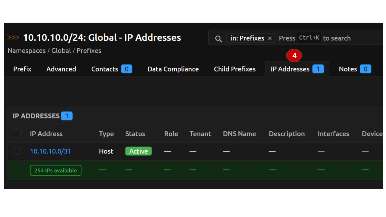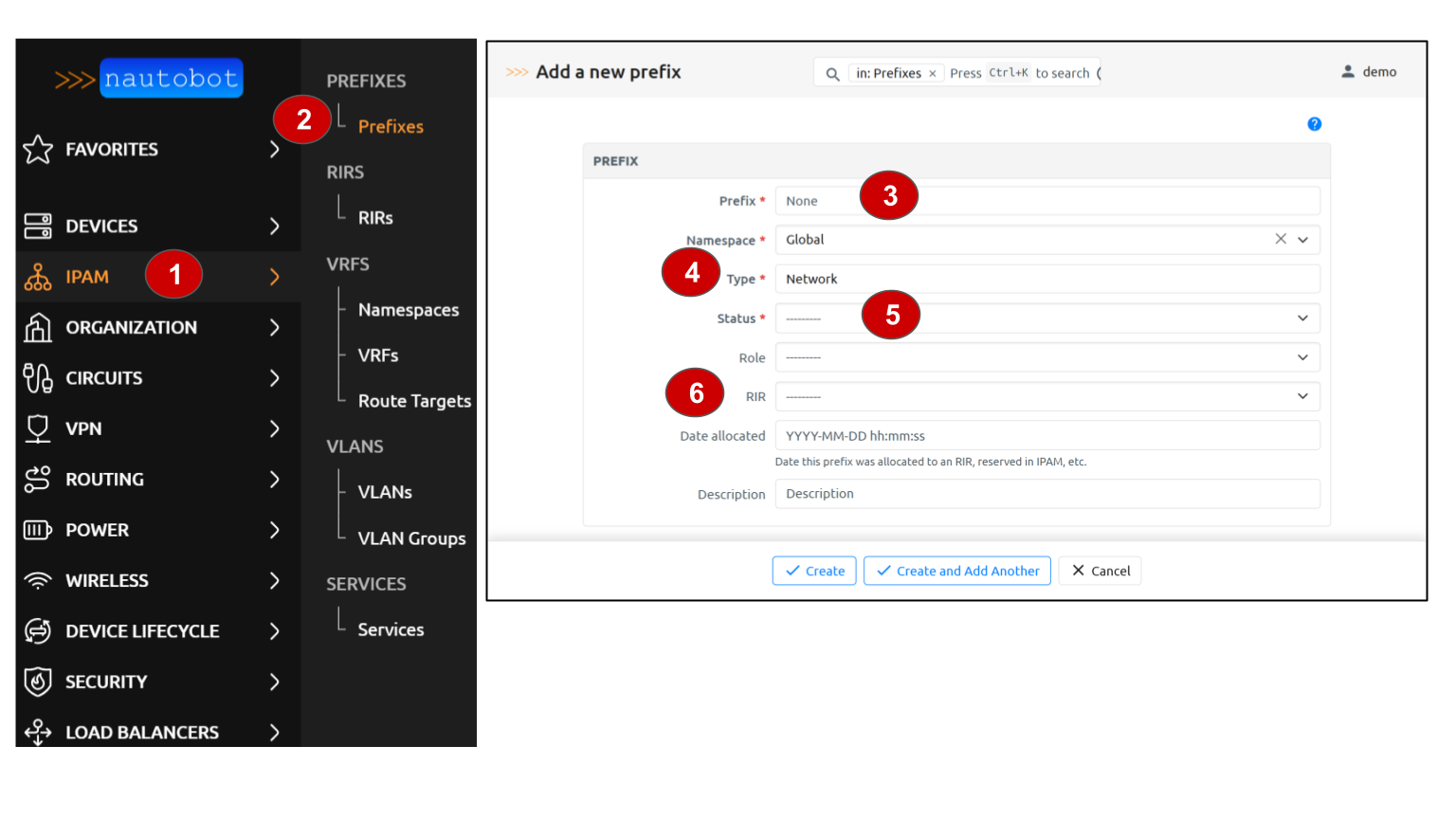 A Prefix is an IPv4 or IPv6 network and mask expressed in CIDR notation (e.g. 192.0.2.0/24). Each Prefix can be assigned to a particular Location, an RIR and virtual routing and forwarding (VRF) instance.