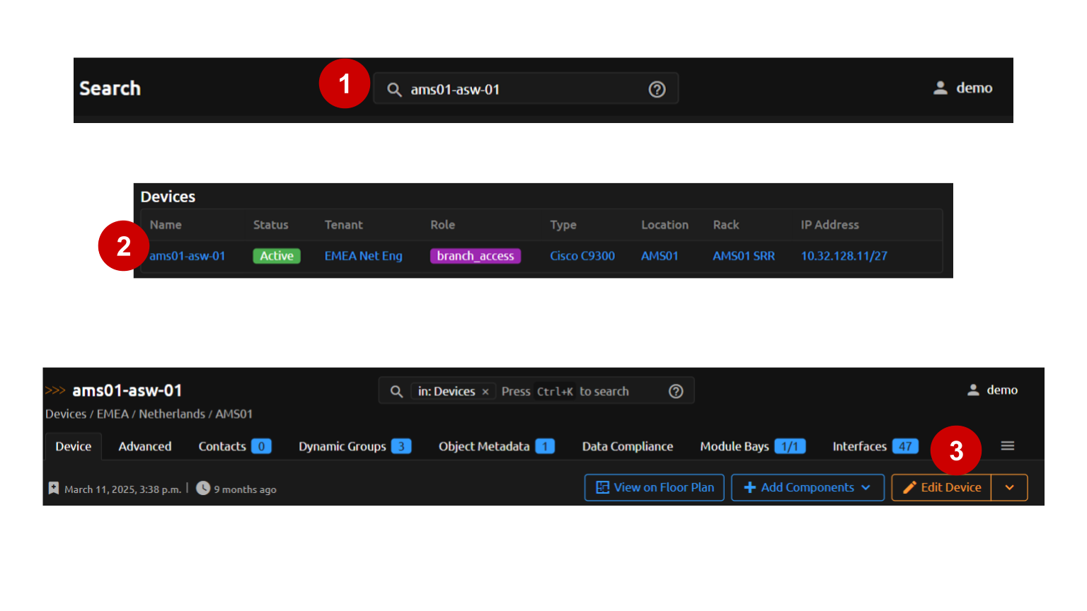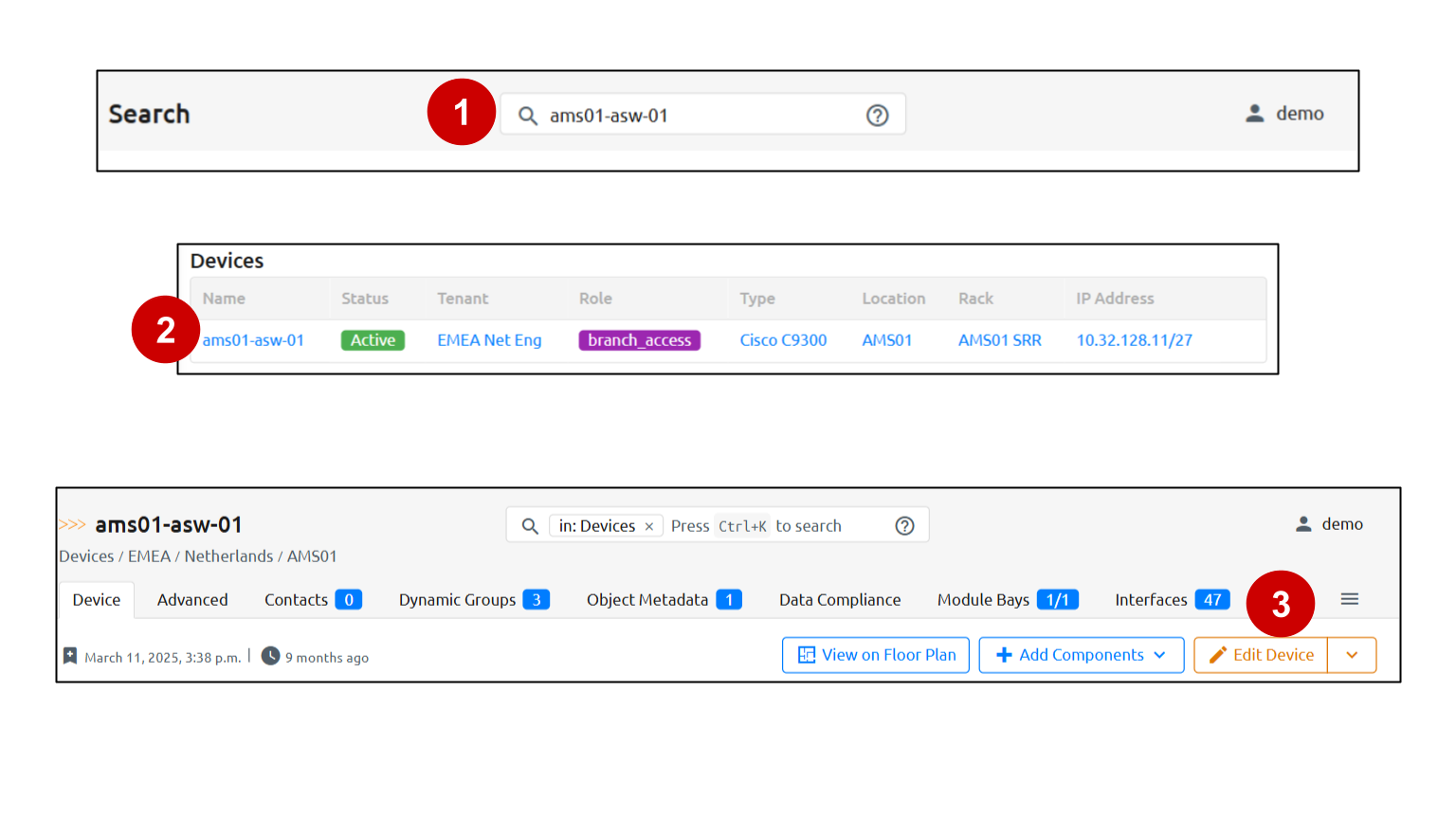 The quickest way to reach the Editing device page for a Device is to search for the Device name
