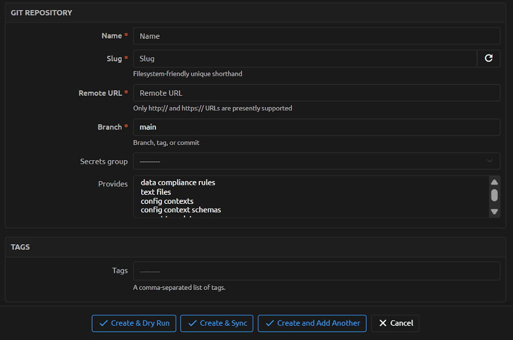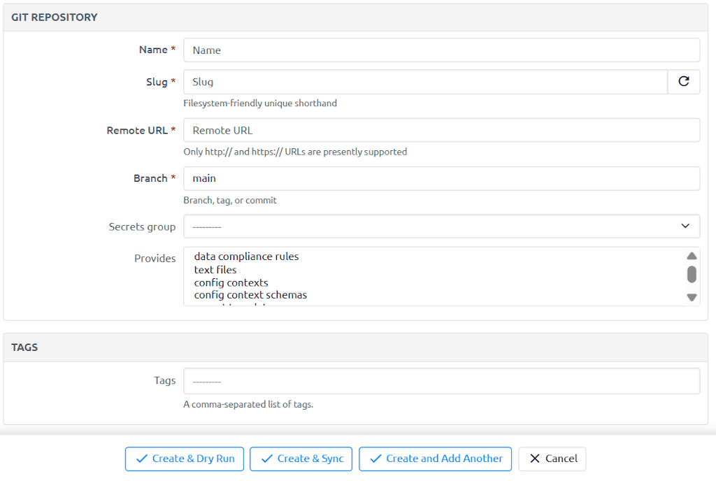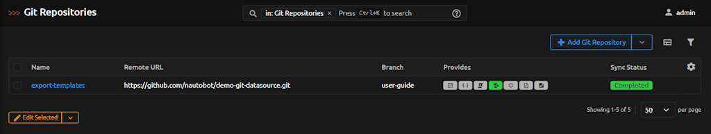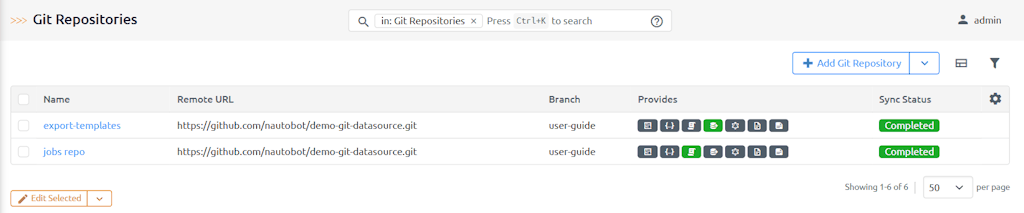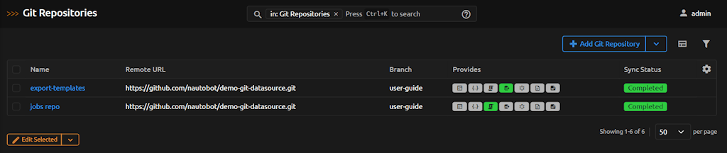 Like other Nautobot features, it is possible to create, read, update, and delete Git repository objects via the REST API as well as via the GUI. In addition, it is also possible to trigger a resync of an existing repository in either interface. For more detail on this and other technical aspects of using this feature, please see the documentation on Git Repositories.