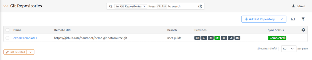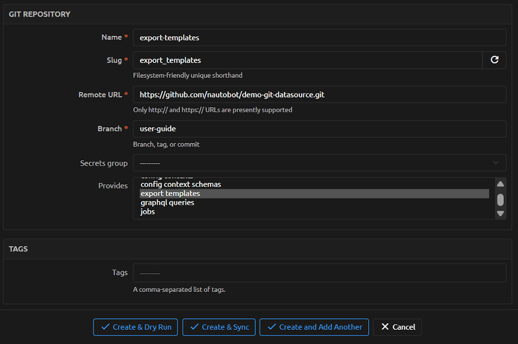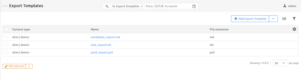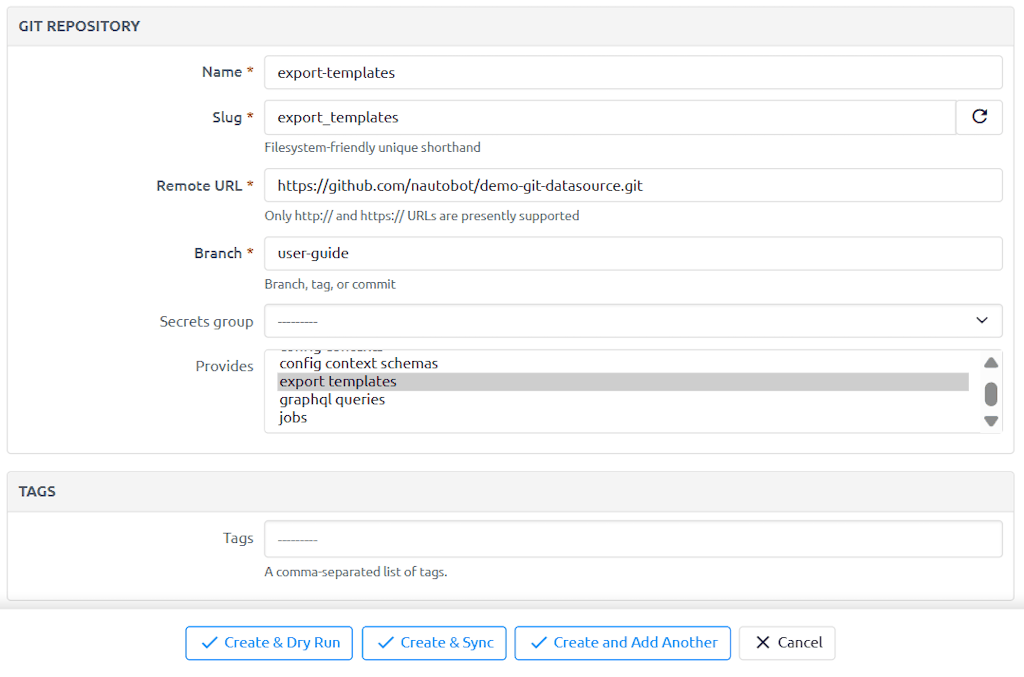 A template can be used to put objects into a specific format for ingestion into another system, tool, or report. It is possible that different templates are needed depending on specific users or teams. This can lead to sprawl of export templates. To keep accurate templates synced with Nautobot the Git Data Sources extensibility feature can be used.