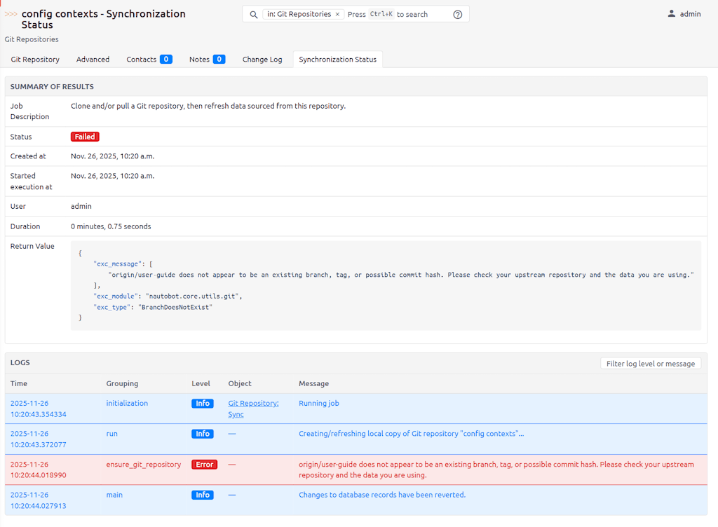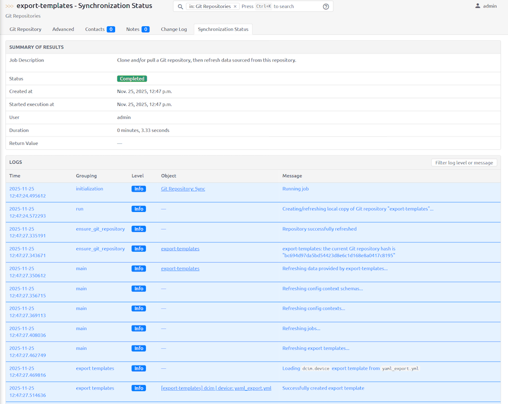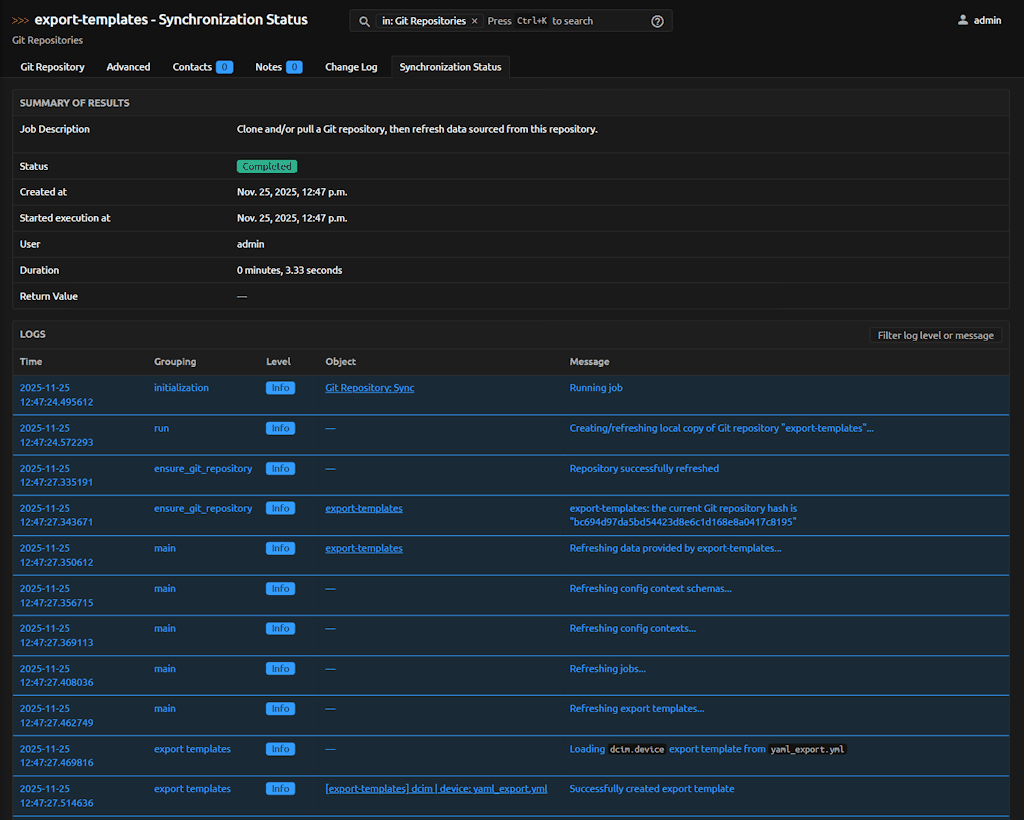 As soon as you click on Create & Sync, Nautobot will clone and sync the repository and provide status of the job.