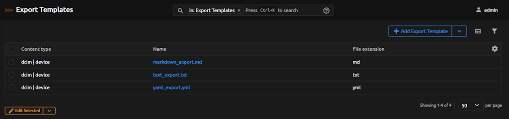 Now that the export templates have been loaded into Nautobot they can be utilized as normal. For example navigate to Devices -> Devices and click on Export in the top right corner, the dropdown will now include the templates loaded from the Git repository.