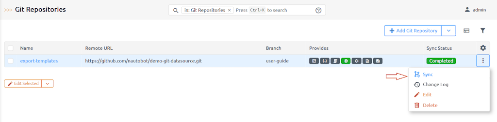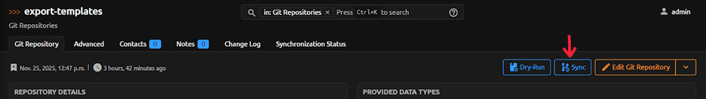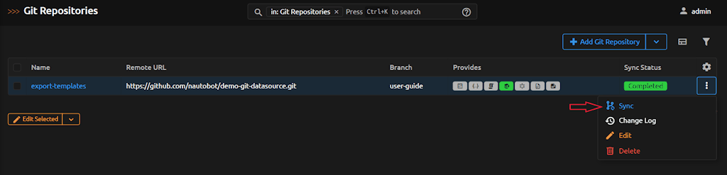 Once the contributor updates the Git repository via normal Git processes and it is reviewed and merged into the branch that was used, a sync process from Nautobot needs to be completed. This can be done from the default Git view, or within a specific detailed view of a Git repository.