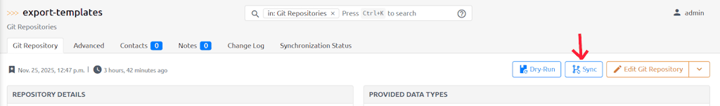 Once the repository is synced each template will now be available in the Export Templates section. Extensibility -> Export Templates.