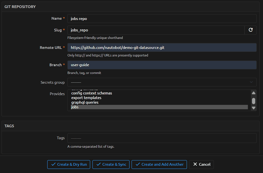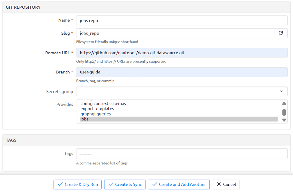 The slug cannot be changed without removing and recreating the Git Repository record. Also, because a repository can potentially provide Jobs, Nautobot requires you to provide a slug that could be used as a Python module name and will not conflict with any existing Python module or package installed in Nautobot. For example, you can't create a repository with the slug nautobot.