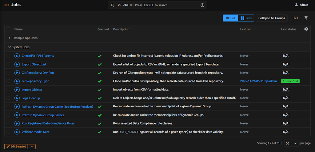 Jobs are a way for users to execute custom logic on demand from within the Nautobot UI. Jobs can interact directly with Nautobot data to accomplish various data creation, modification, and validation tasks.