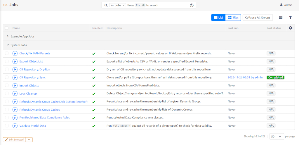 Once the scripts have been pushed into the repository, a sync needs to be executed, after which navigating to Jobs via Jobs -> Jobs will show the new jobs loaded from the Git repository.