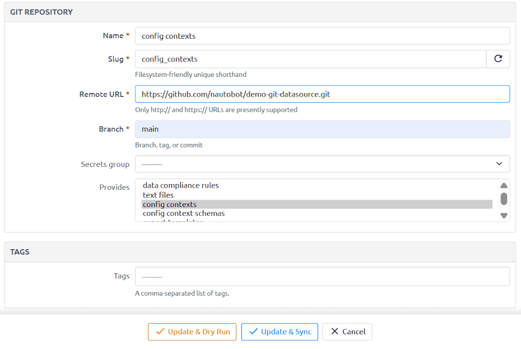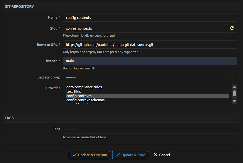 There is a huge benefit to having config contexts managed by a Git workflow. This type of data can be modified often, especially platform specifics, or new device roles. Utilizing a standard Git workflow allows for all the proper reviews and approvals to be accomplished before accepting the changes into Nautobot for use.