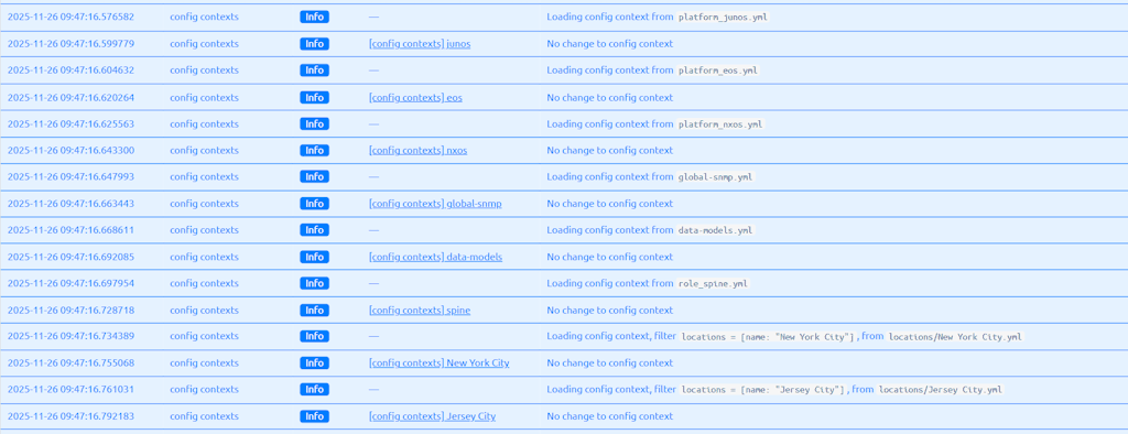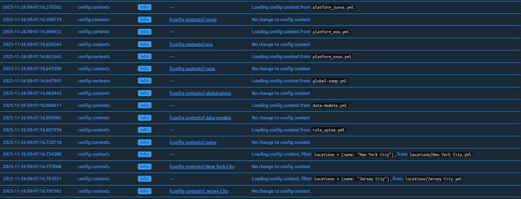 • Follows an inheritance methodology similar to what Ansible implements. Global contexts can be overwritten by local contexts at both a group level, as well as at a device specific level.