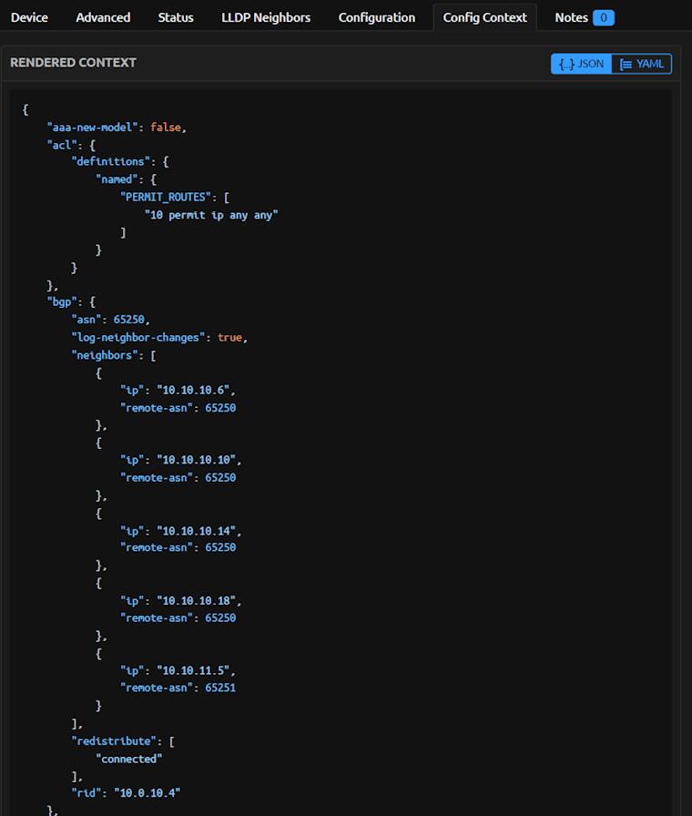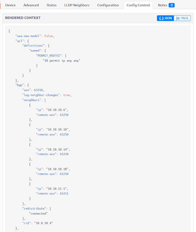 • Nautobot UI provides a simple view to see merged config contexts. It can be visualized by navigating to a device and clicking on the config contexts tab.