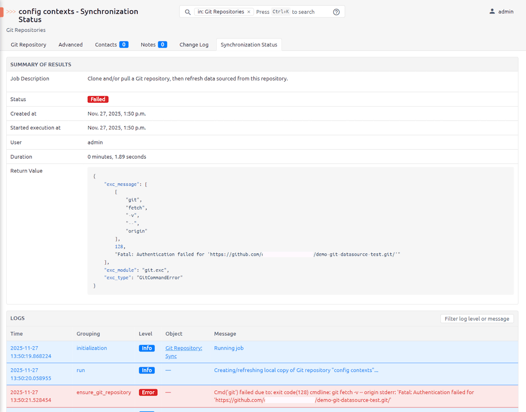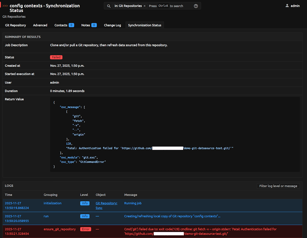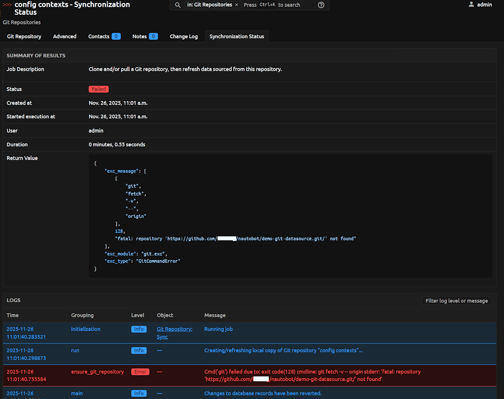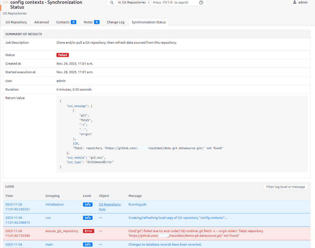 • Repository is linked, but data is not properly loaded into Nautobot.