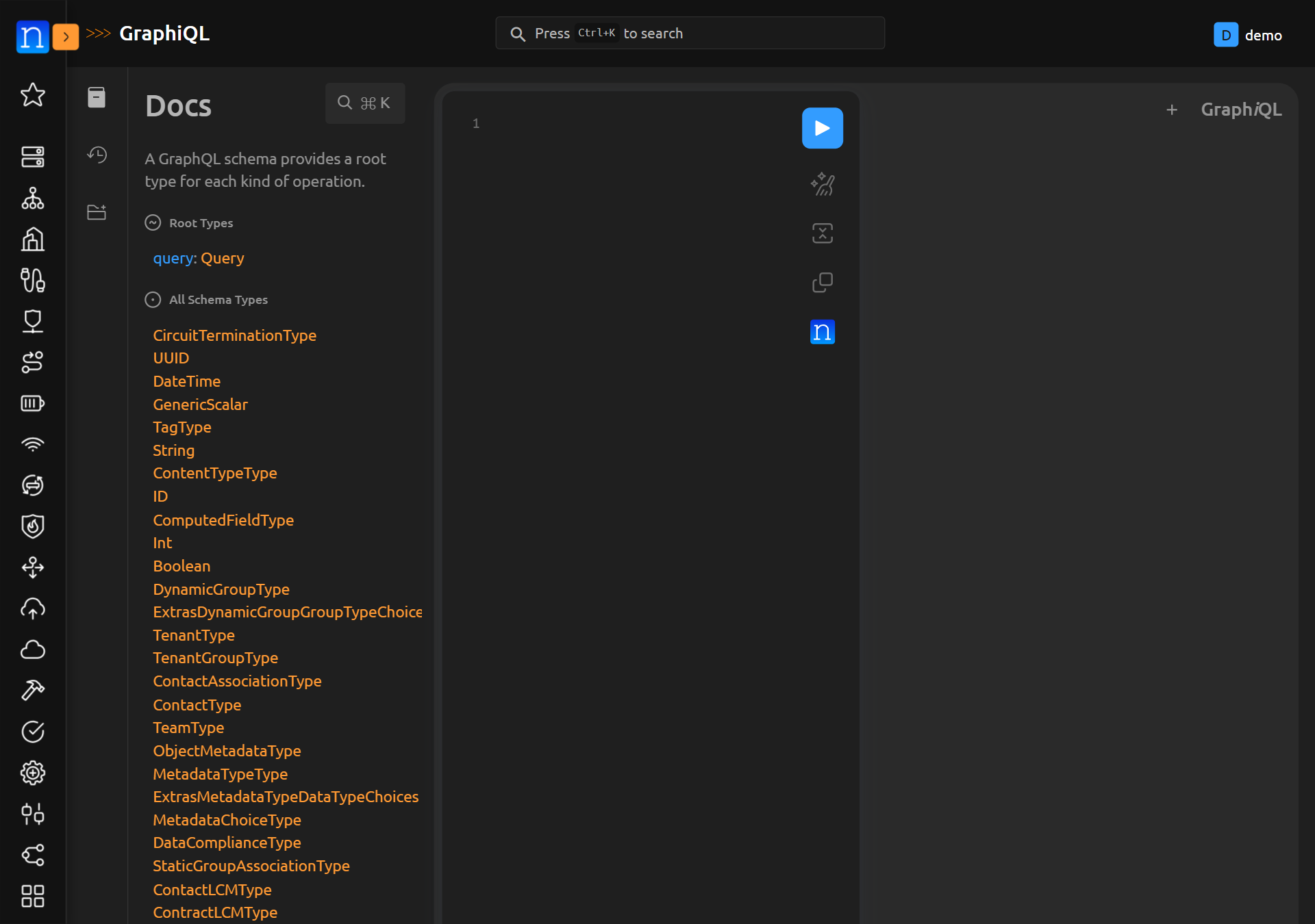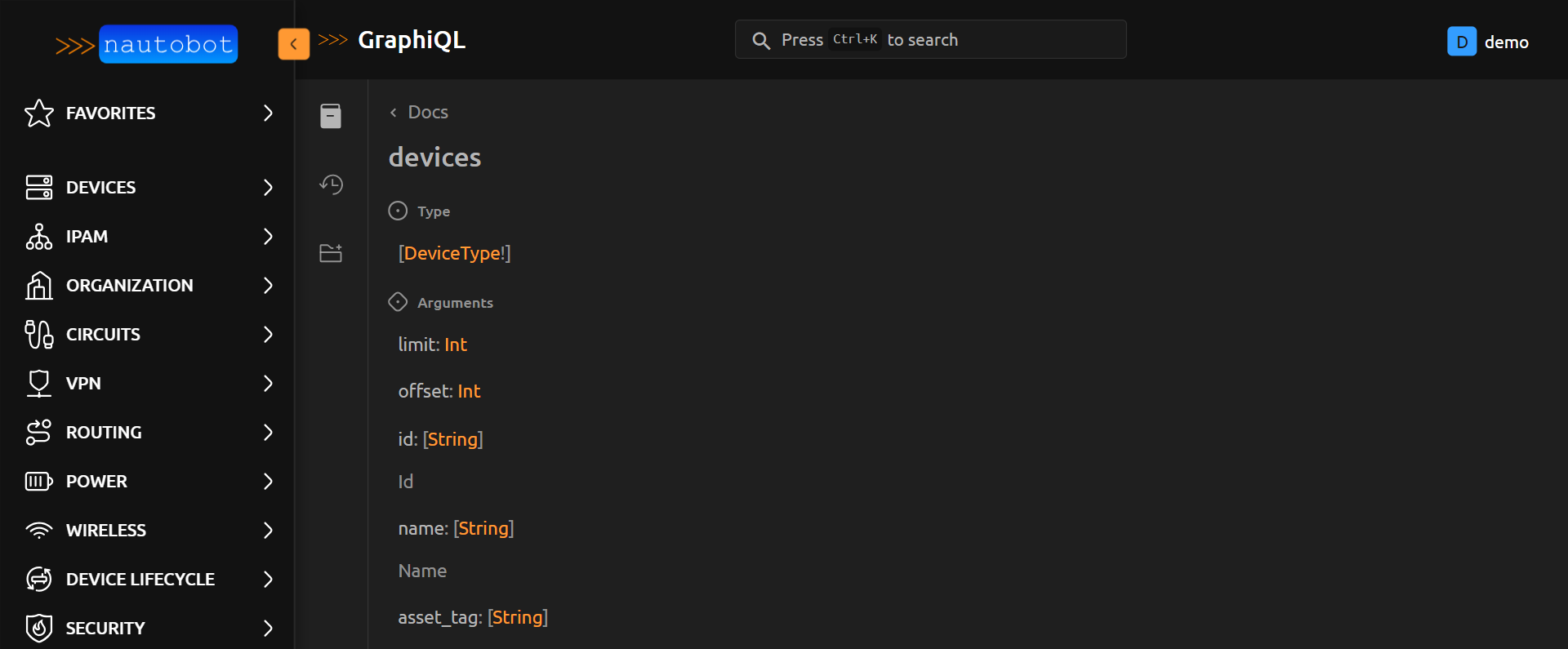 If you're new to GraphQL, take a little bit of time to explore the Documentation Explorer. This can be accomplished by clicking the < Docs link in the GraphiQL interface. The information within Documentation Explorer is specific to creating queries in Nautobot.