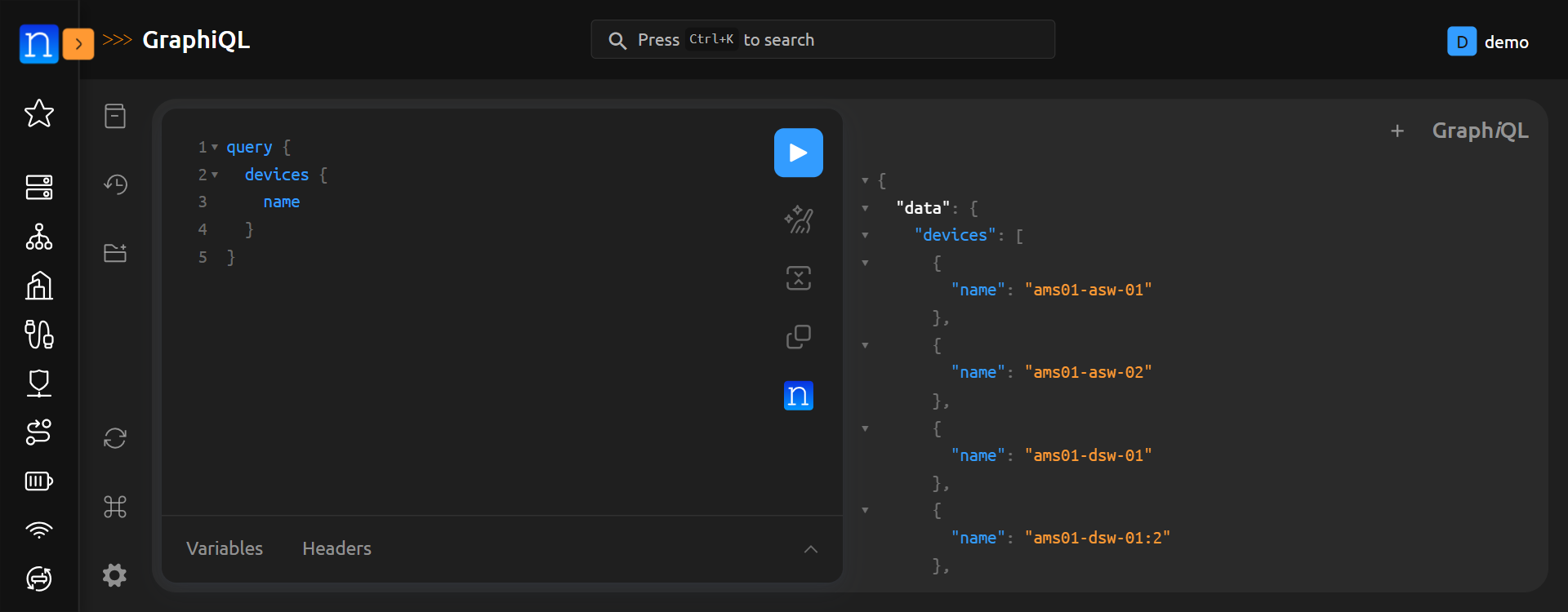 GraphQL queries are encapsulated in query { } flags (simply { } is also acceptable). With that in mind, let's craft our query from the GraphiQL interface to inspect all devices and display their device names. To do this, let's execute:
