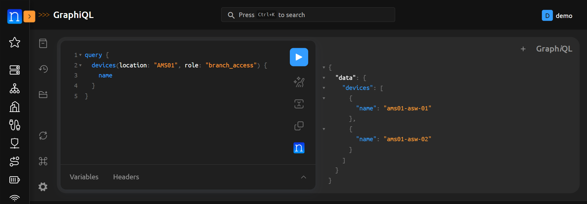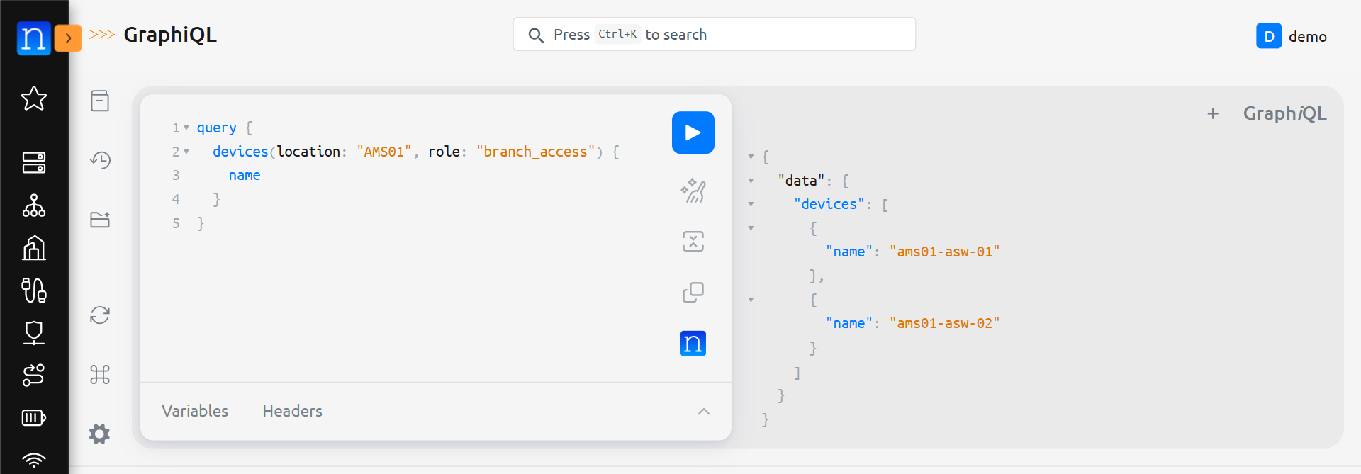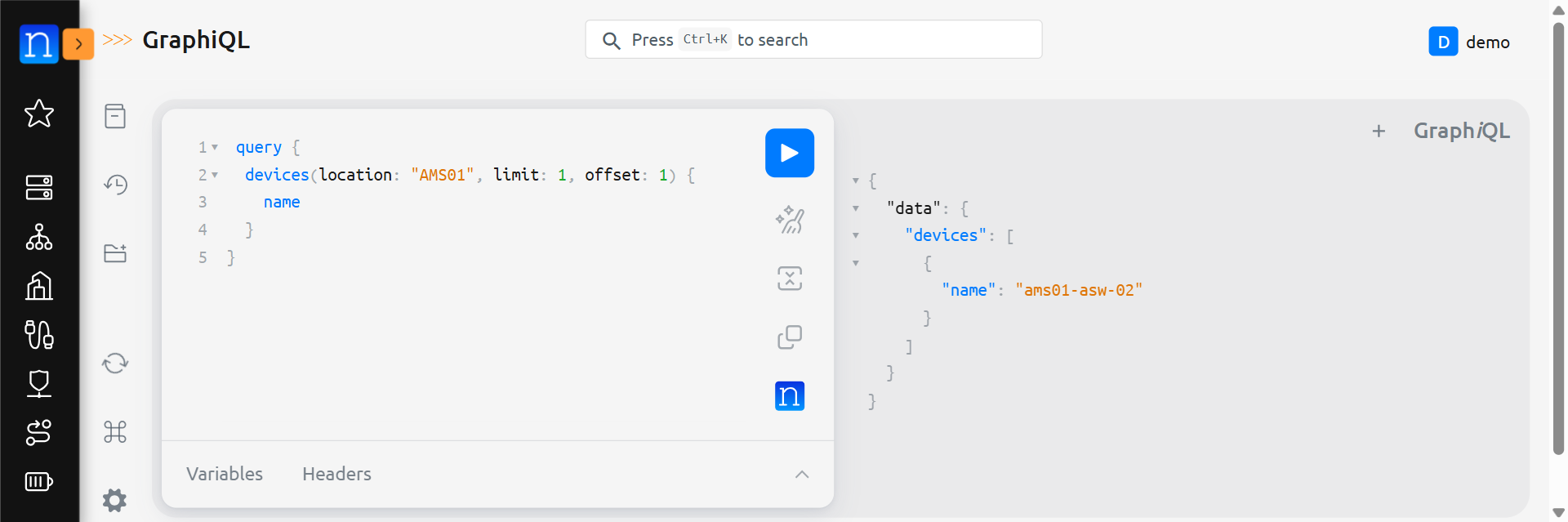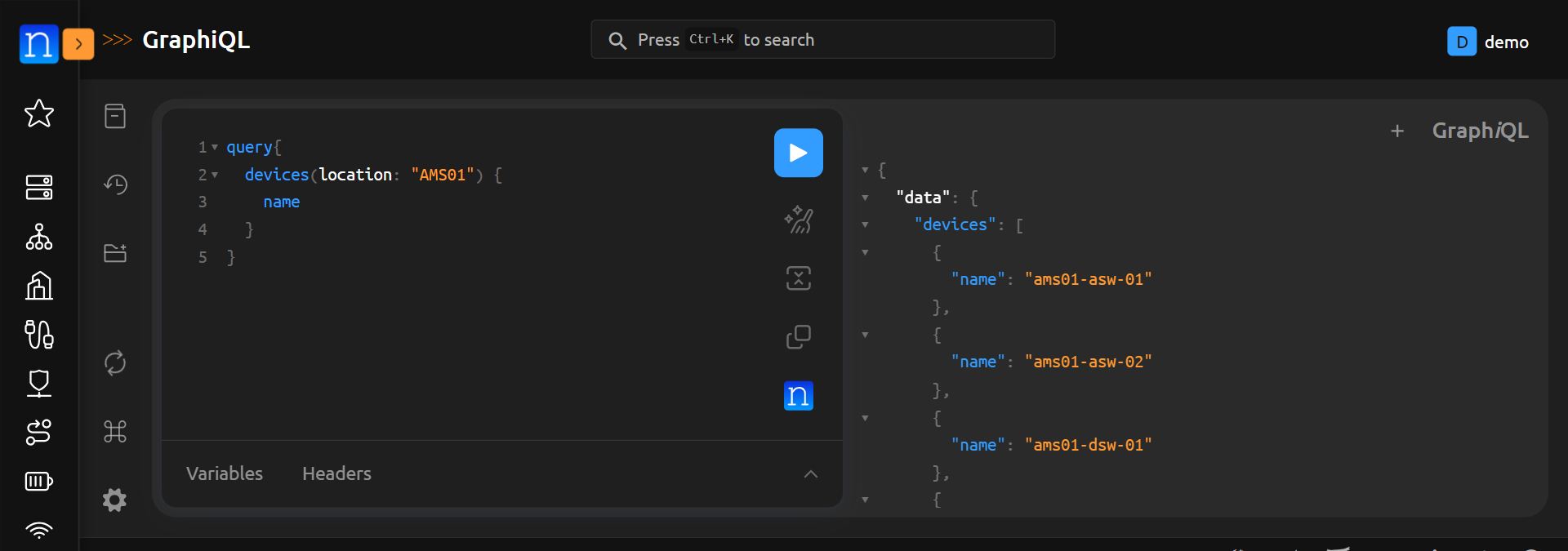 As an example. We can query devices by their location. This is done by adding (location: "<location name>") after devices. For example: query { devices(location: "AMS01") { name }} will display all devices in the AMS01 location.