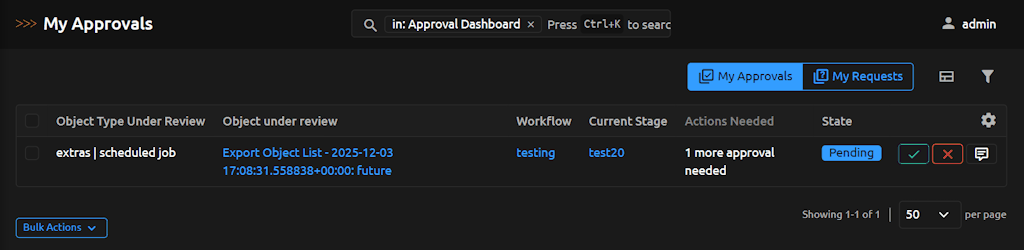 extras.view_approvalworkflow- to view created approval workflows after creating, updating, or running an object.extras.view_approvalworkflowstage- to view the My Requests tab on the Dashboard.extras.view_approvalworkflowstageresponse- to view responses for each stage.