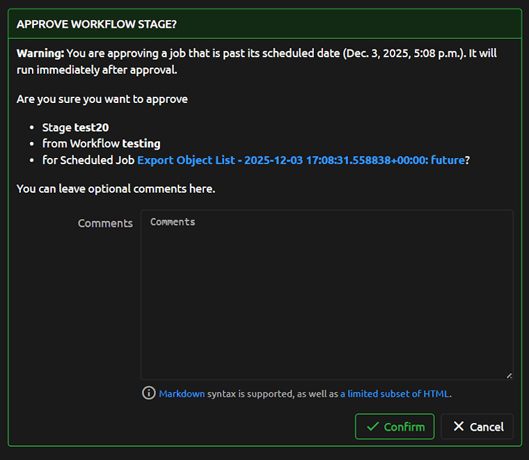 - An Object Operator submits a job for approval. See Running Jobs Via the Web UI or Scheduling via the UI. If an approval workflow definition exists, the approval workflow is created automatically.