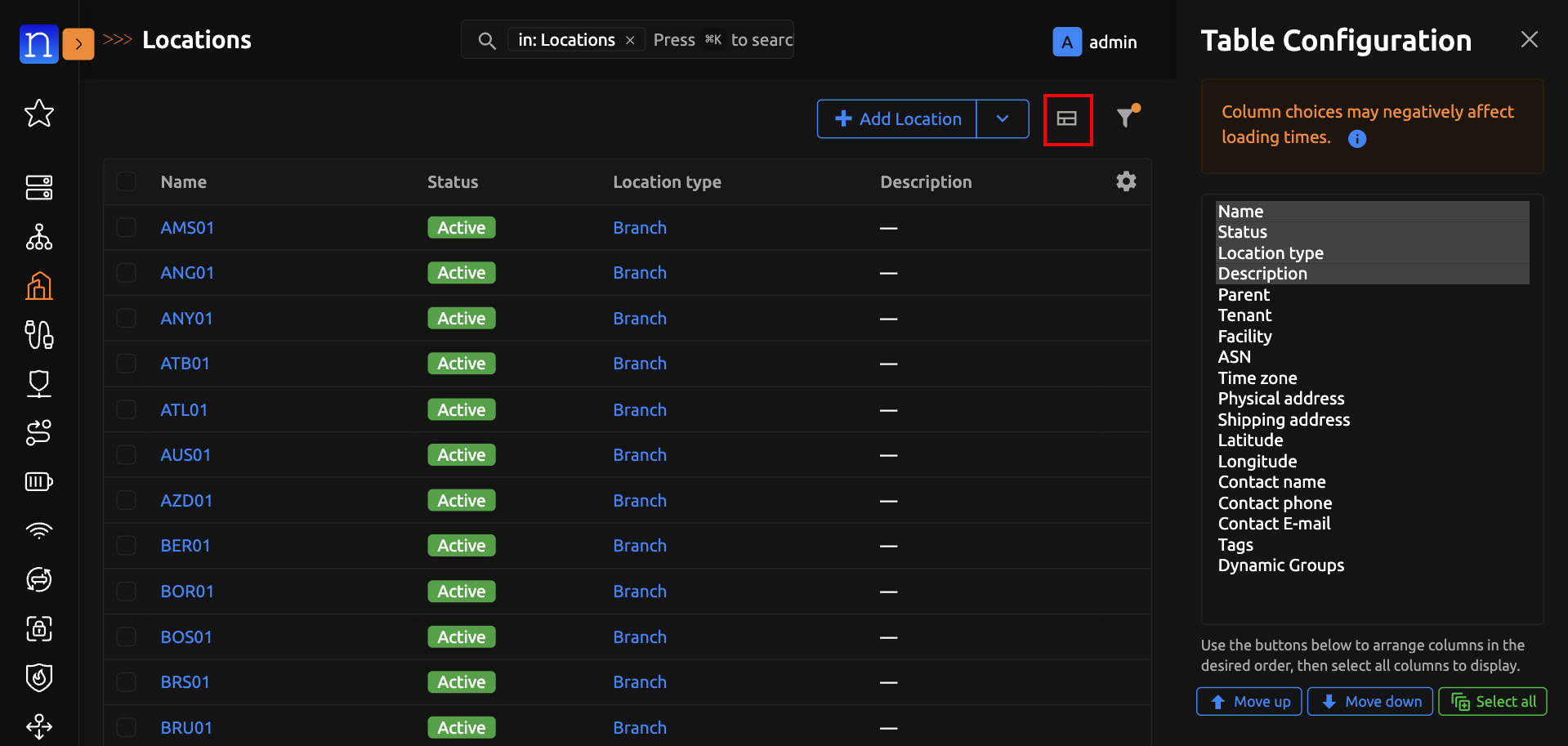 The config attribute holds the configuration of the list view, stored as a dictionary. For example, a configuration for the list view dcim:location_list might appear as follows: