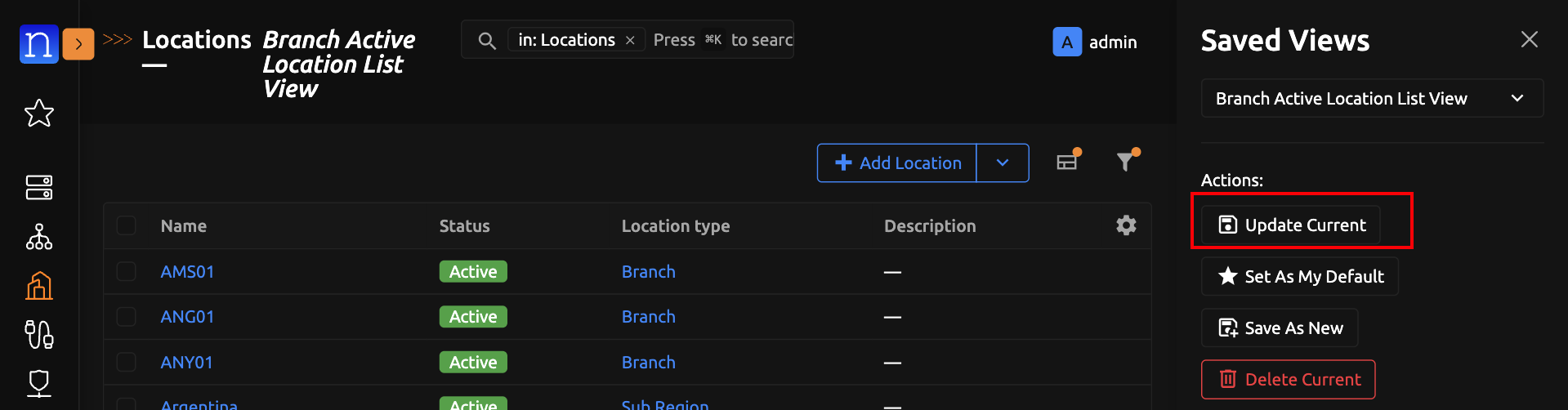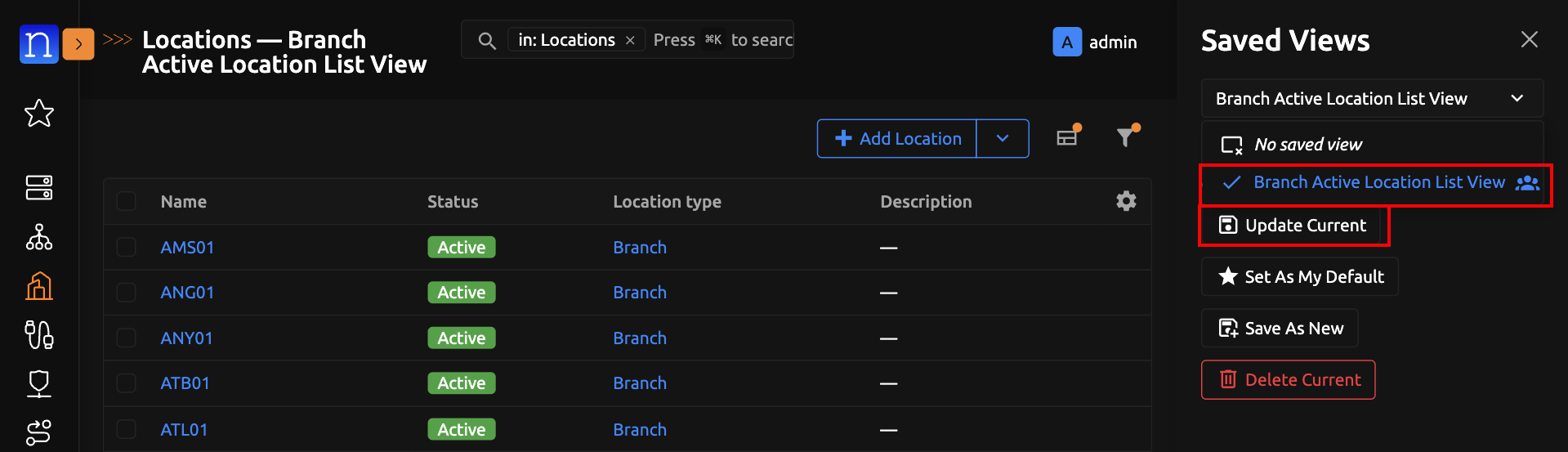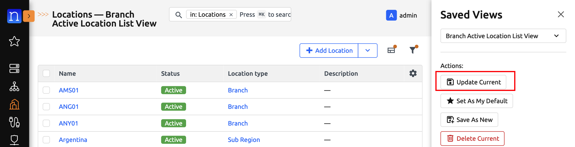 Click "Update Current Saved View" option and the page should refresh and you should see the success banner on top of the page stating "Successfully updated current view Branch Active Location List View".