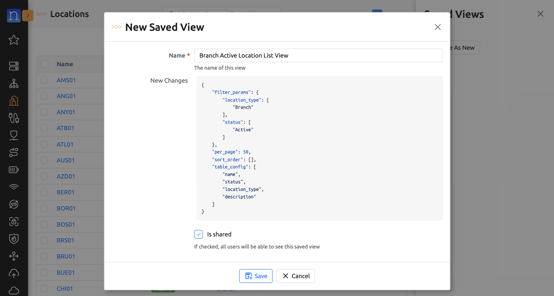 Click the "Save" button on the modal and the browser should take you to the new Saved View. Note the success banner on top of the page stating "Successfully created new Saved View Branch Active Location List View". Note that the current Saved View name also appeared in the page heading. This is an indicator that you are currently viewing a Saved View.