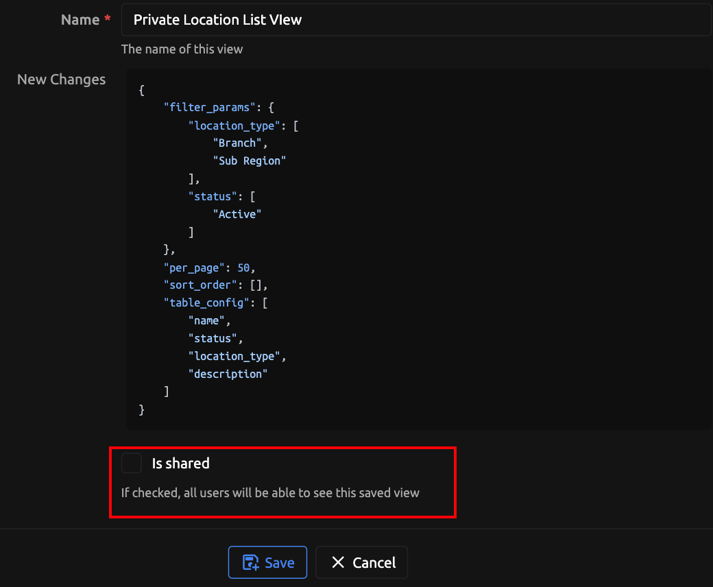 Clicking on the edit button will direct you to a standard edit view where you can edit the name, is_shared and is_global_default attributes of the current Saved View.