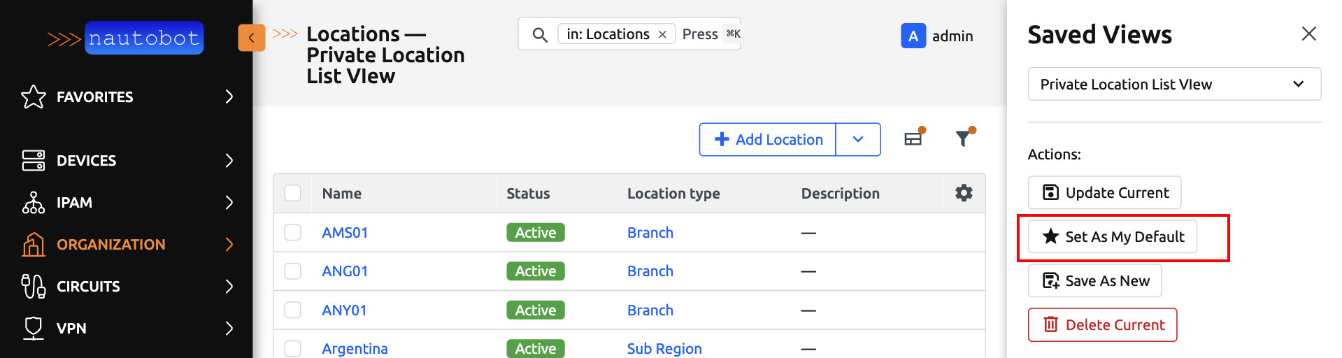 You can also set a Saved View as default for an object list view for yourself, overriding the global default. You can set a view as default by navigate to the view from the Saved View icon, for example, "Private Location List View". Clicking on the Saved Views icon again, you should be able to see the option named "Set As My Default".