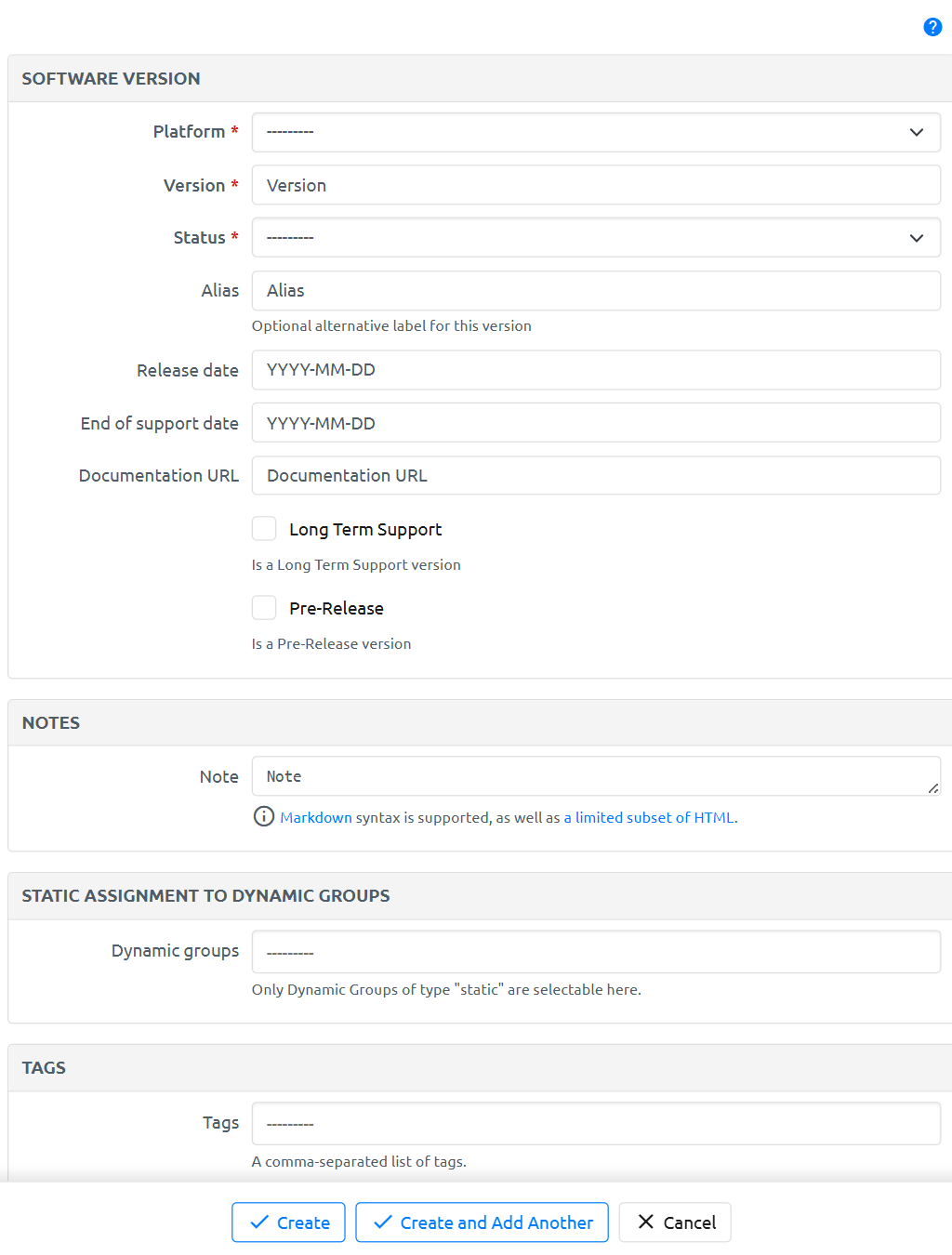 To create a new Software Version, navigate to Devices > Software Versions and click Add. (/dcim/software-versions/add/) The Platform, Version and Status fields are all required. You can use the Alias field if you would like to add a friendly name for the Software Version. There are optional fields for Release Date, End of Support Date, Documentation URL and booleans for Long Term Support and Pre-Release.