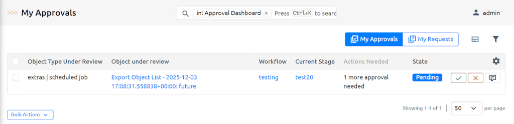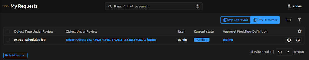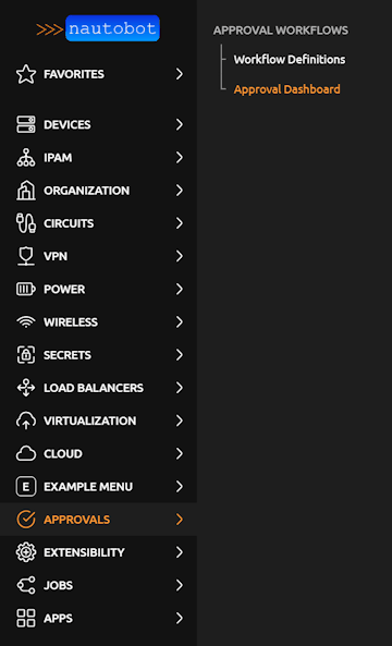 extras.view_approvalworkflow- to view created approval workflows after creating, updating, or running an object.extras.view_approvalworkflowstage- to view the My Requests tab on the Dashboard.extras.view_approvalworkflowstageresponse- to view responses for each stage.