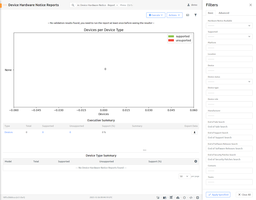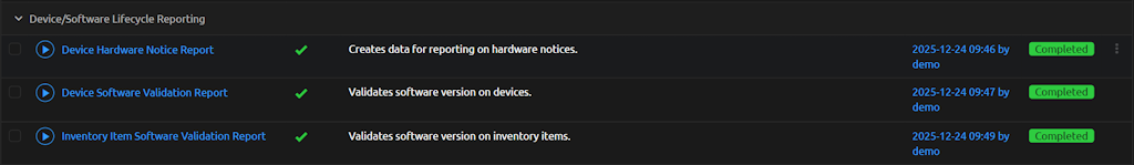 - The "Device Lifecycle" dropdown menu and selecting either Device Software Validation - Report, Inventory Item Software Validation - Report or Device Hardware Notice - Report and then clicking on Run Software Validation execute button on right side of screen.