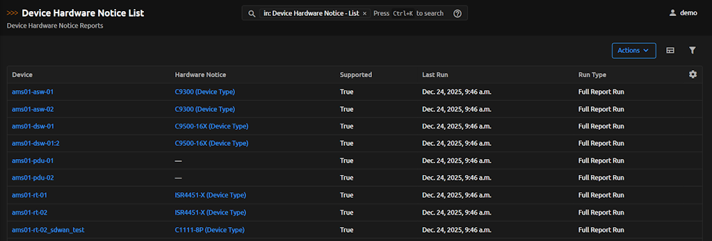 | Device: device-3 - Supported | 65c048f4-2f0e-4969-8ed0-27fc9e520882 | nautobot_device_lifecycle_mgmt.devicehardwarenoticeresult | device-3__atl01_united-states-of-america_65c0 | True | 2024-07-15T15:34:54.765155Z | full-report-run | device-3 | NoObject | ATL01 | United States Of America | NoObject | Cisco | type-3 | 2024-07-10T15:42:55.701268Z | 2024-07-15T15:35:03.528545Z |