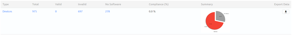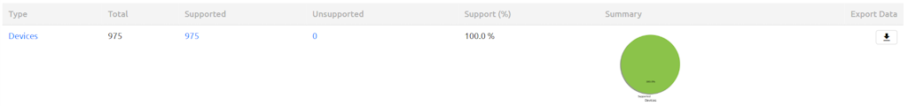 From the Device Software Validation and Hardware Notice Reports you can export the report results using the Export Data column. The export will be a CVS file. To gather all results export data from the Executive Summary row or you can export each individual Device Type/Inventory Item in its row.