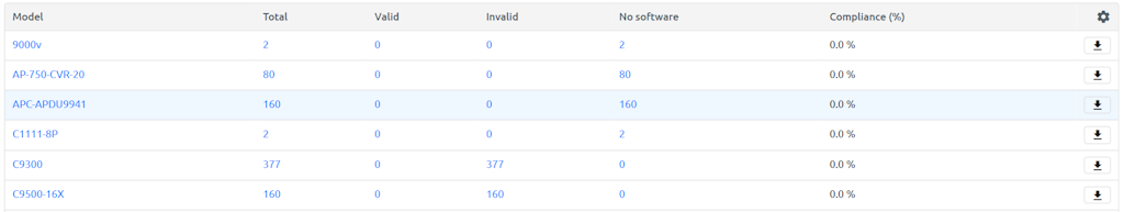 The software validation list page contains the software report results for each device. All columns are sortable and filters can be applied.