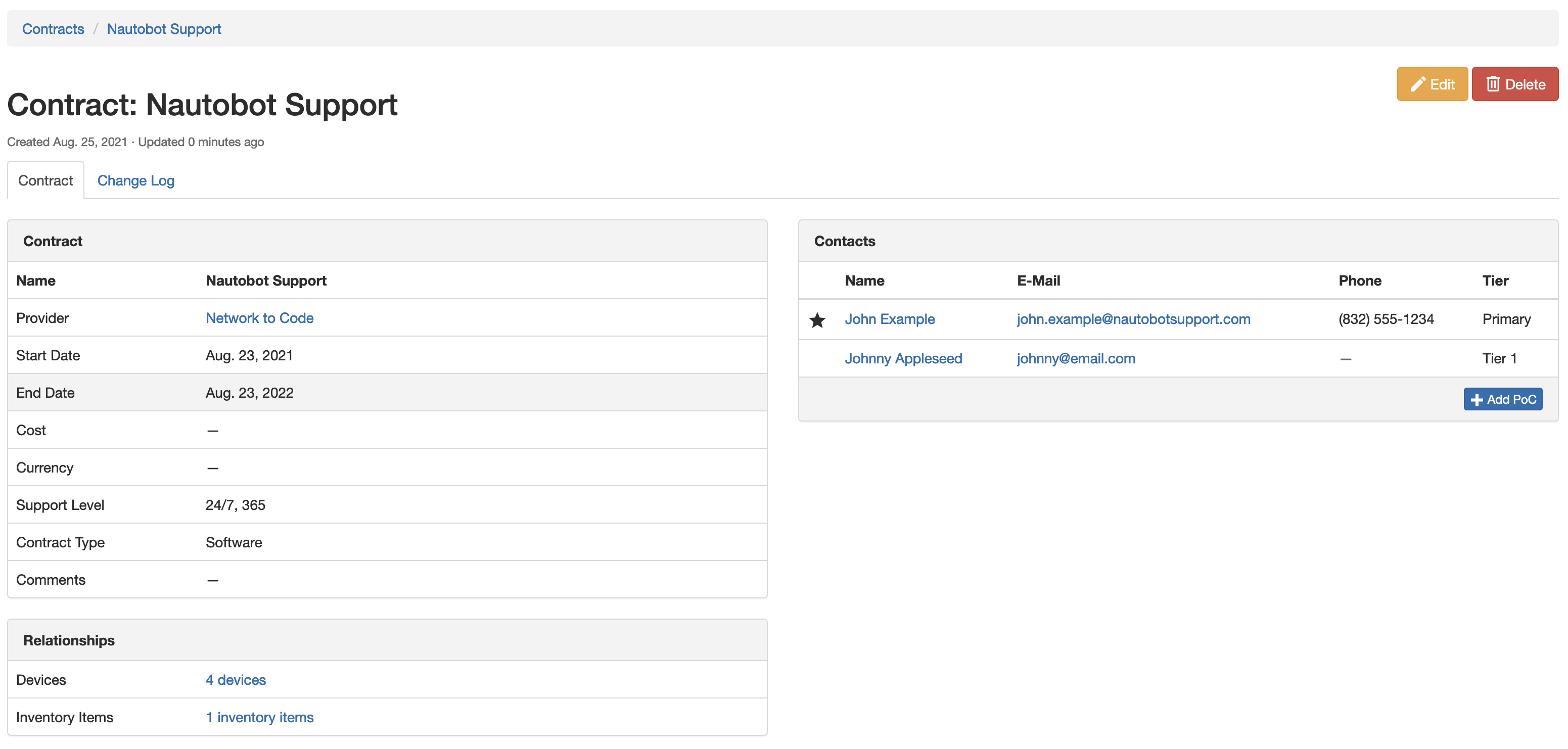 You can view the details of a contract along with the primary and escalation contacts. This view will also give you an association to the devices under this contract.