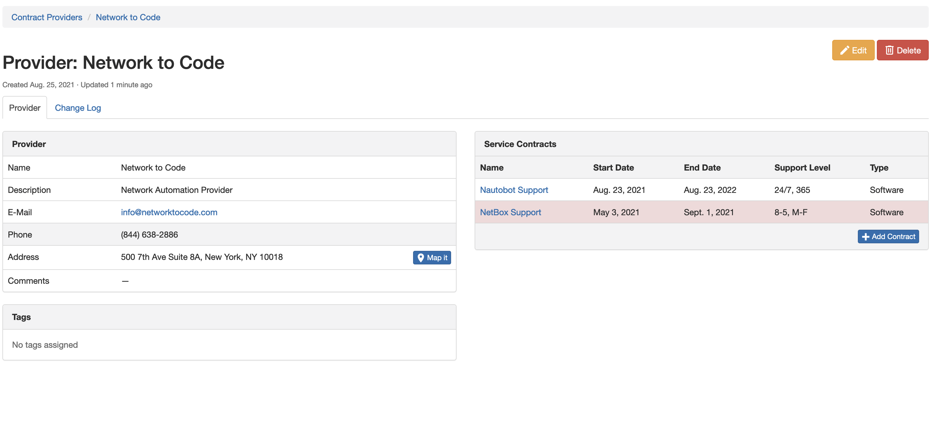 You can view the details of a provider, along with a listing of the service contracts associated to the provider. Contracts that are expired will display in red.