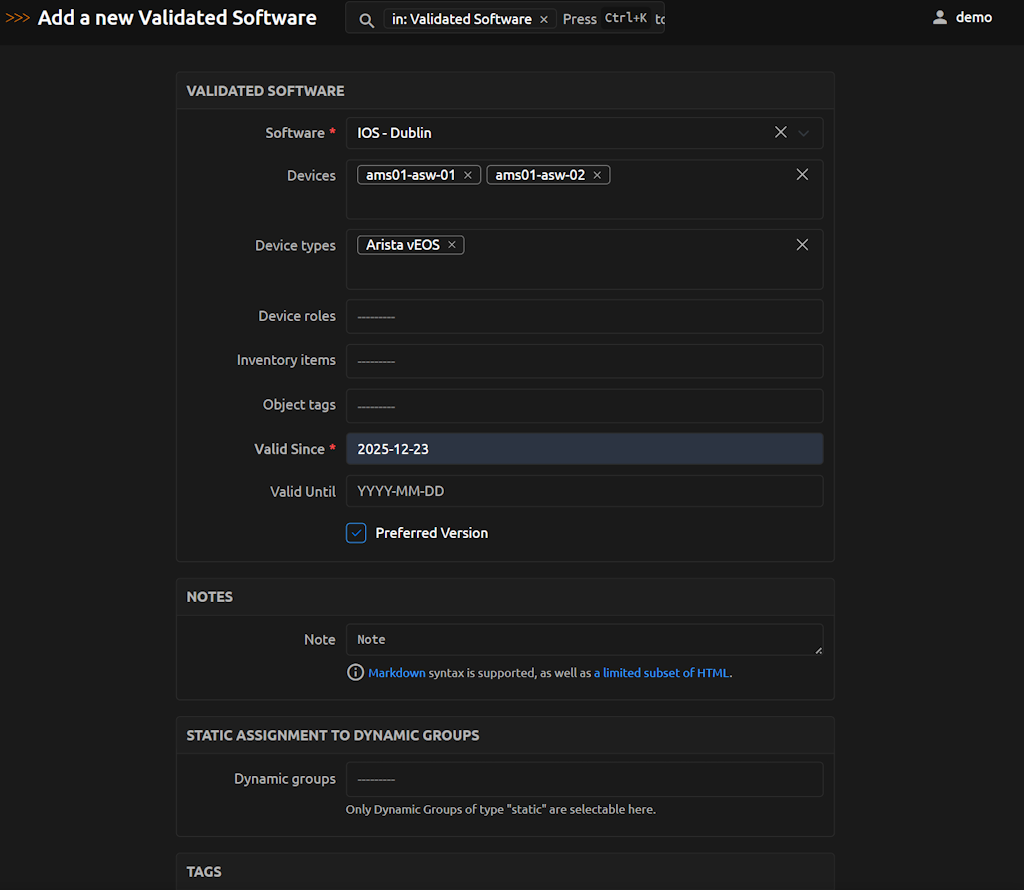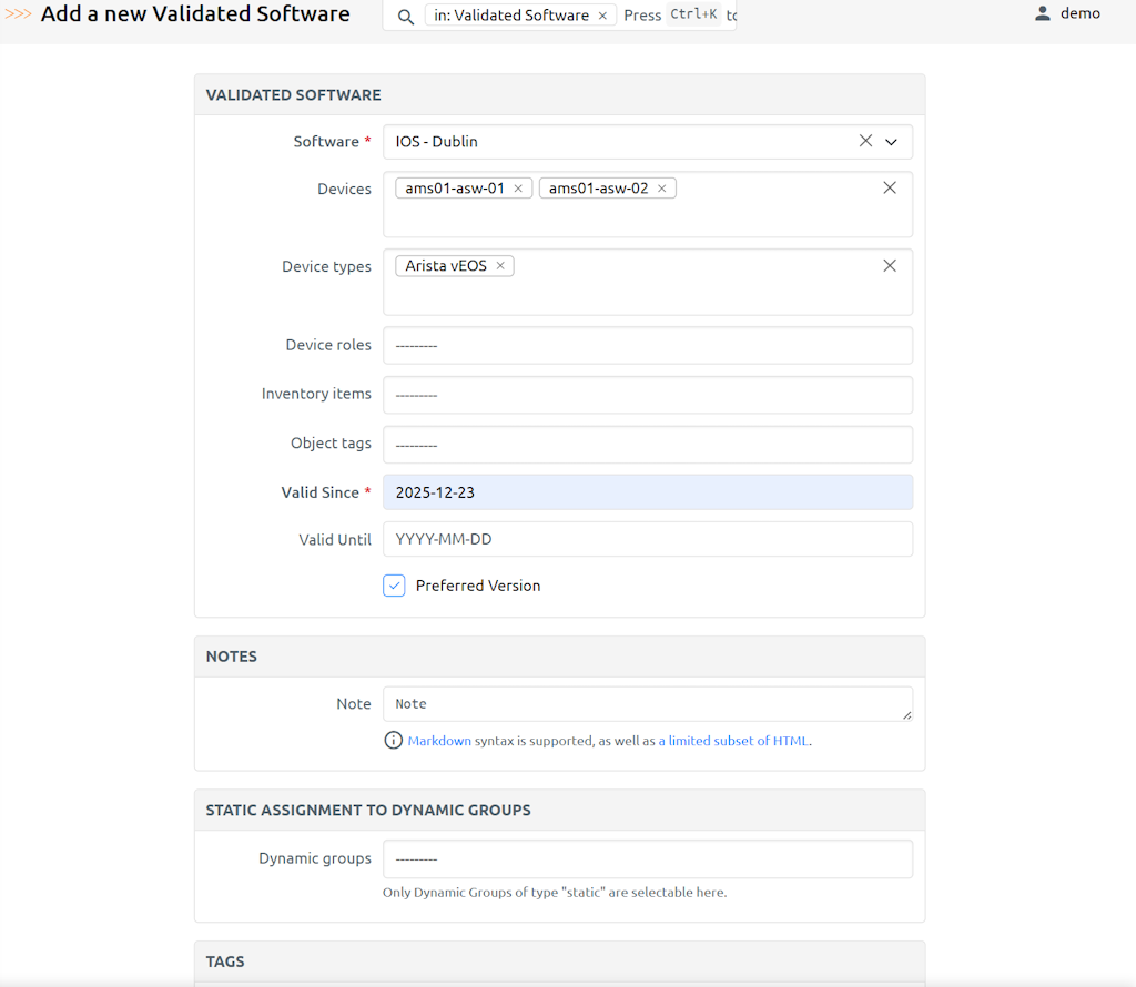 {{NAUTOBOT_URL}}/api/plugins/nautobot-device-lifecycle-mgmt/validated-software/?inventory_item_id=33b0c49e-0ee9-409c-b136-f008a3cdf033{ "count": 1, "next": null, "previous": null, "results": [ { "id": "94aabc58-7654-40b0-9d6a-2a71f6b2449c", "url": "https://demo.nautobot.com/api/plugins/nautobot-device-lifecycle-mgmt/validated-software/94aabc58-7654-40b0-9d6a-2a71f6b2449c/", "software": { "id": "96dba607-19b2-4875-8d02-a8b4667afd69", "url": "https://demo.nautobot.com/api/plugins/nautobot-device-lifecycle-mgmt/software/96dba607-19b2-4875-8d02-a8b4667afd69/", "device_platform": "835e363f-c922-4540-b0c0-aaeac2a1be15", "version": "4.25.6M", "end_of_support": null, "display": "Arista EOS - 4.25.6M" }, "devices": [], "device_types": [ "b77ff7f2-c9ac-49f1-a74e-9dc32545ce1e" ], "device_roles": [], "inventory_items": [], "object_tags": [ "dcde1fc2-8f55-44f7-bc17-155e5e7d944d" ], "start": "2021-06-15", "end": "2023-11-23", "preferred": true, "valid": true, "custom_fields": {}, "tags": [], "display": "Arista EOS - 4.25.6M - Valid since: 2021-06-15" } ] }