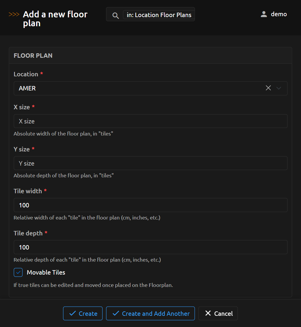 Clicking this button will open a standard Nautobot create/edit form. This form allows you to define the parameters of the floor plan for the selected Location.