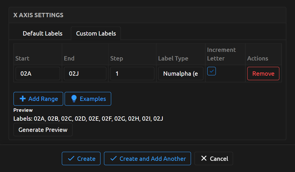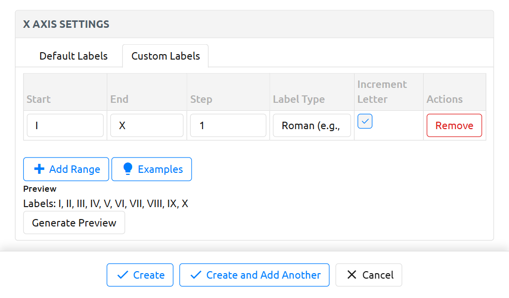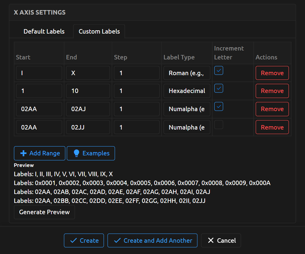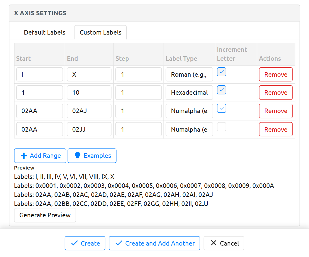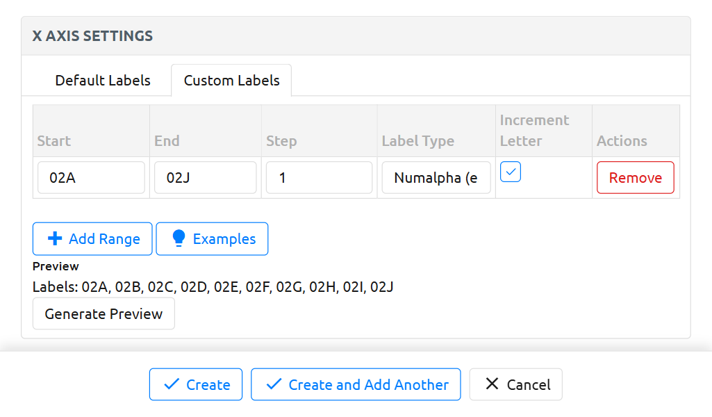 The Custom Labels tab provides options to configure a custom label range using the following parameters: start, end, step, increment_letter, and label_type.