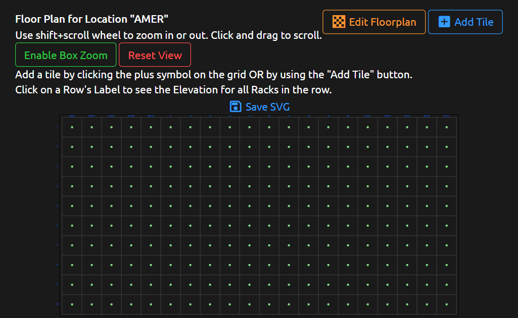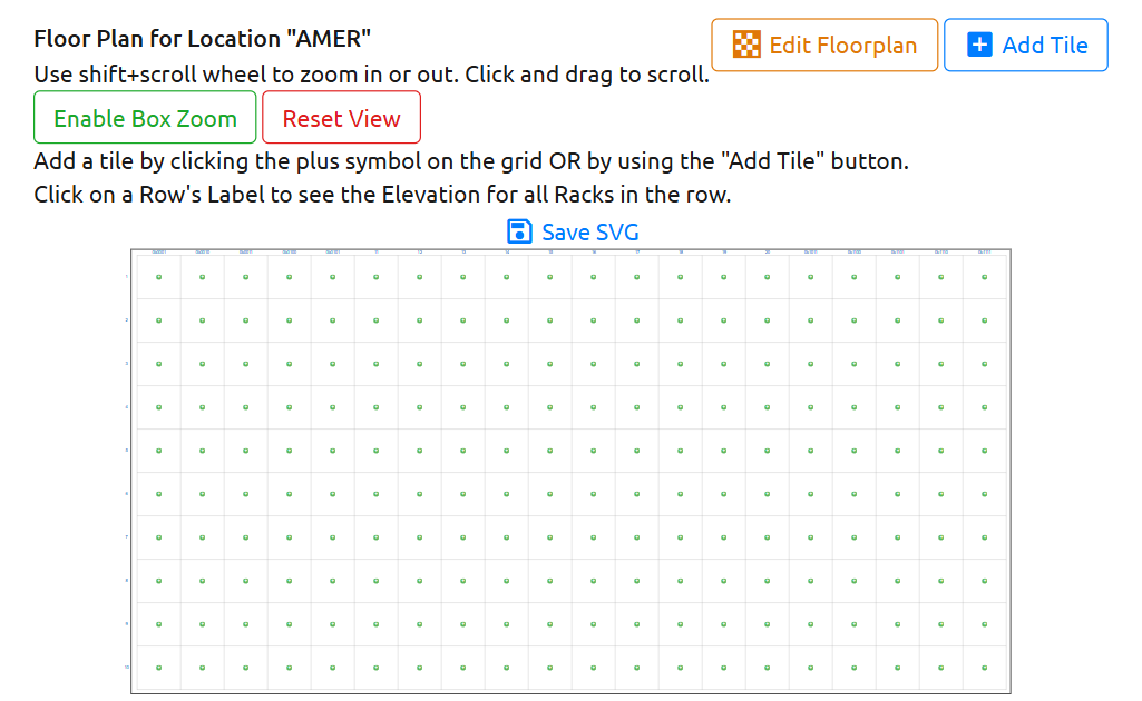 Clicking on a grid label for a given row (or column) will navigate to a Rack Elevation view of racks filtered by the Floor Plan and the Racks in the chosen row (or column).