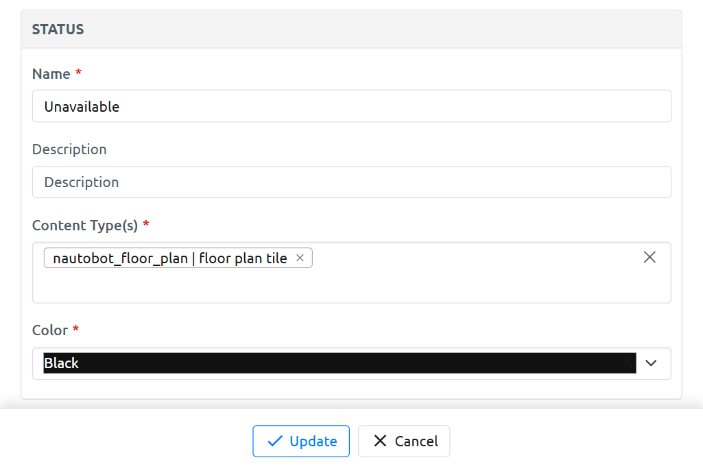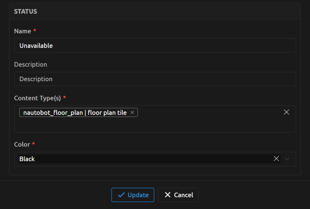 The first step is to define which Status(es) can be applied to individual tiles in a floor plan. Navigate to "Organization > Statuses" in the Nautobot UI and create or update the desired Status records to include nautobot_floor_plan | floor plan tile as one of the Status's Content Types.