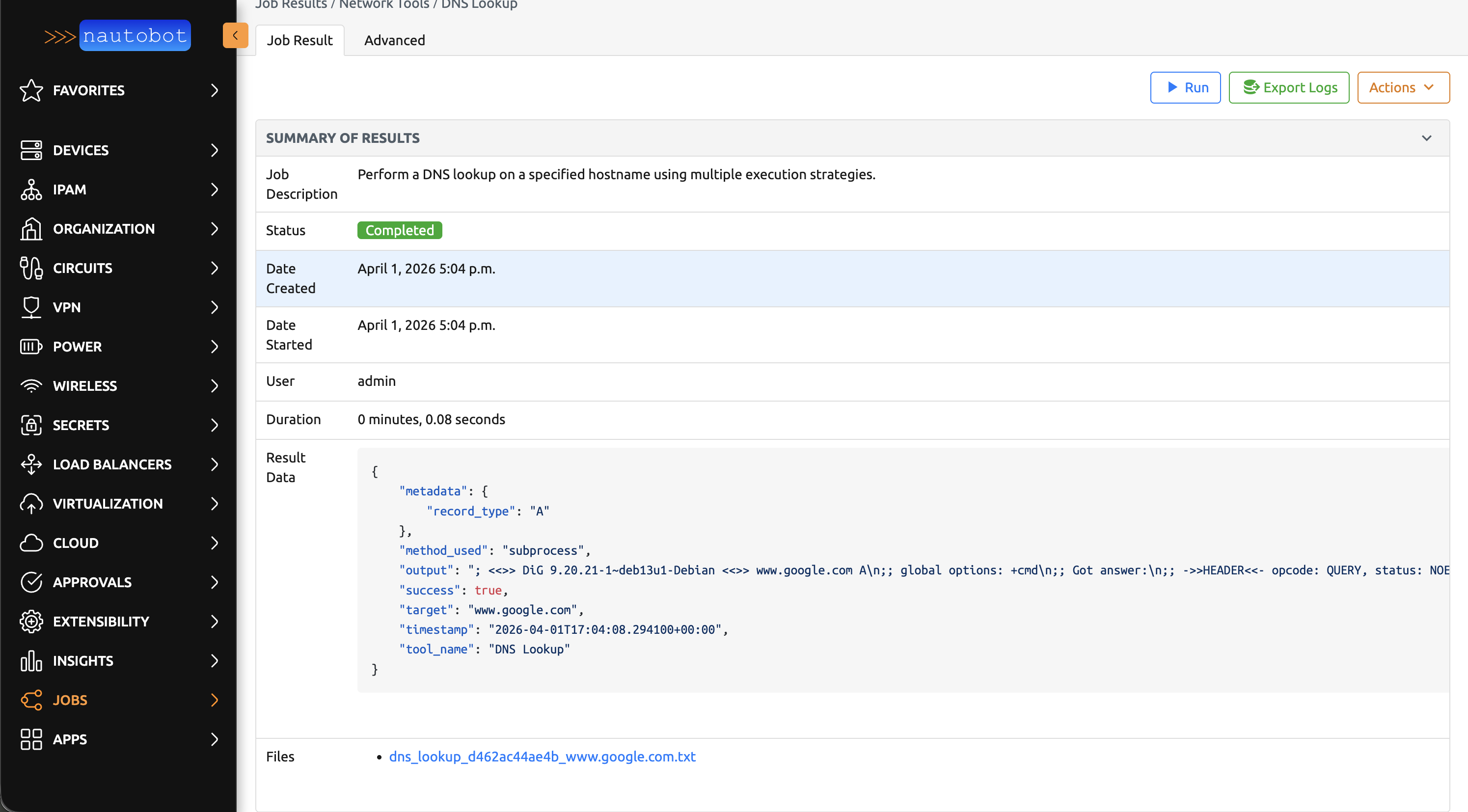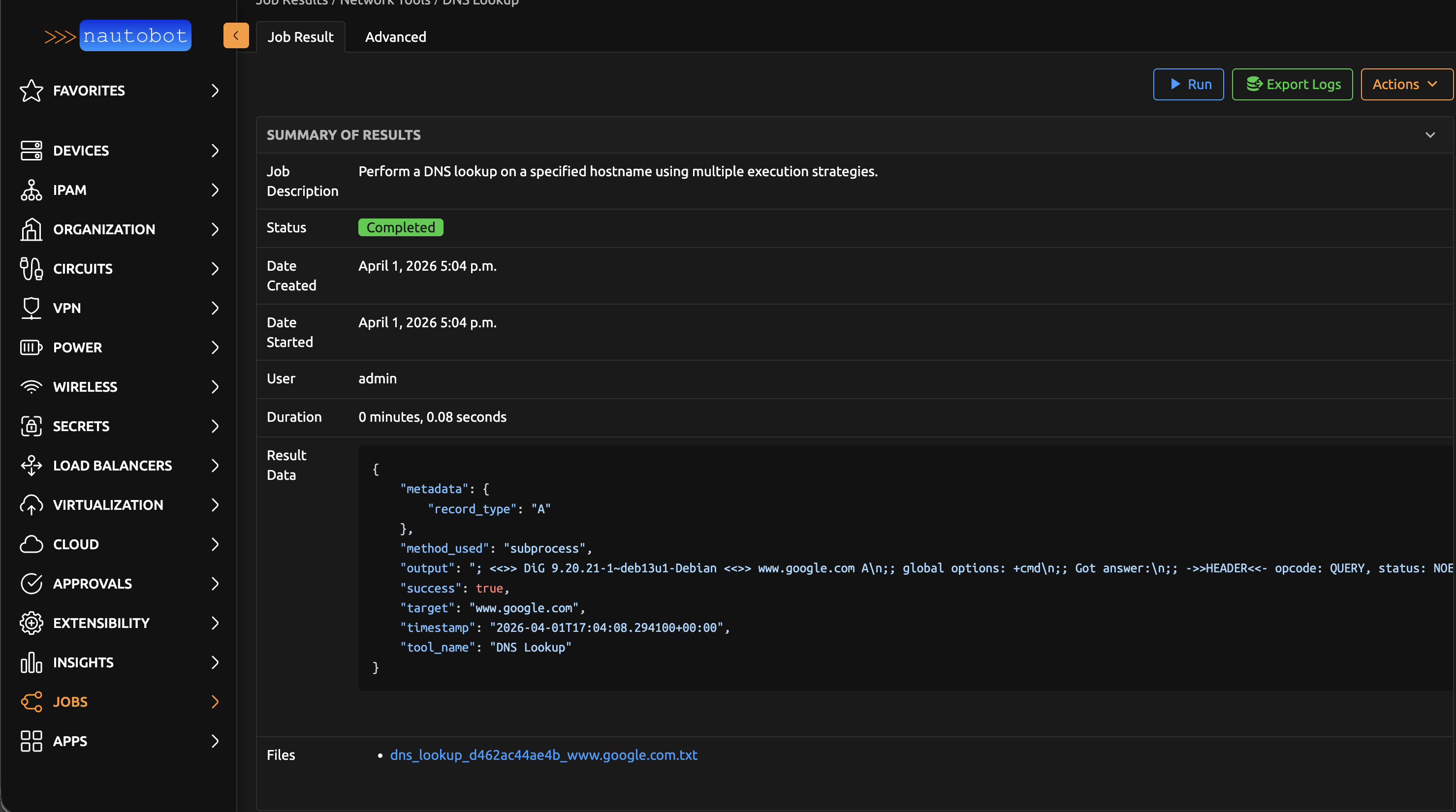 DNS Lookup job result showing dig output.