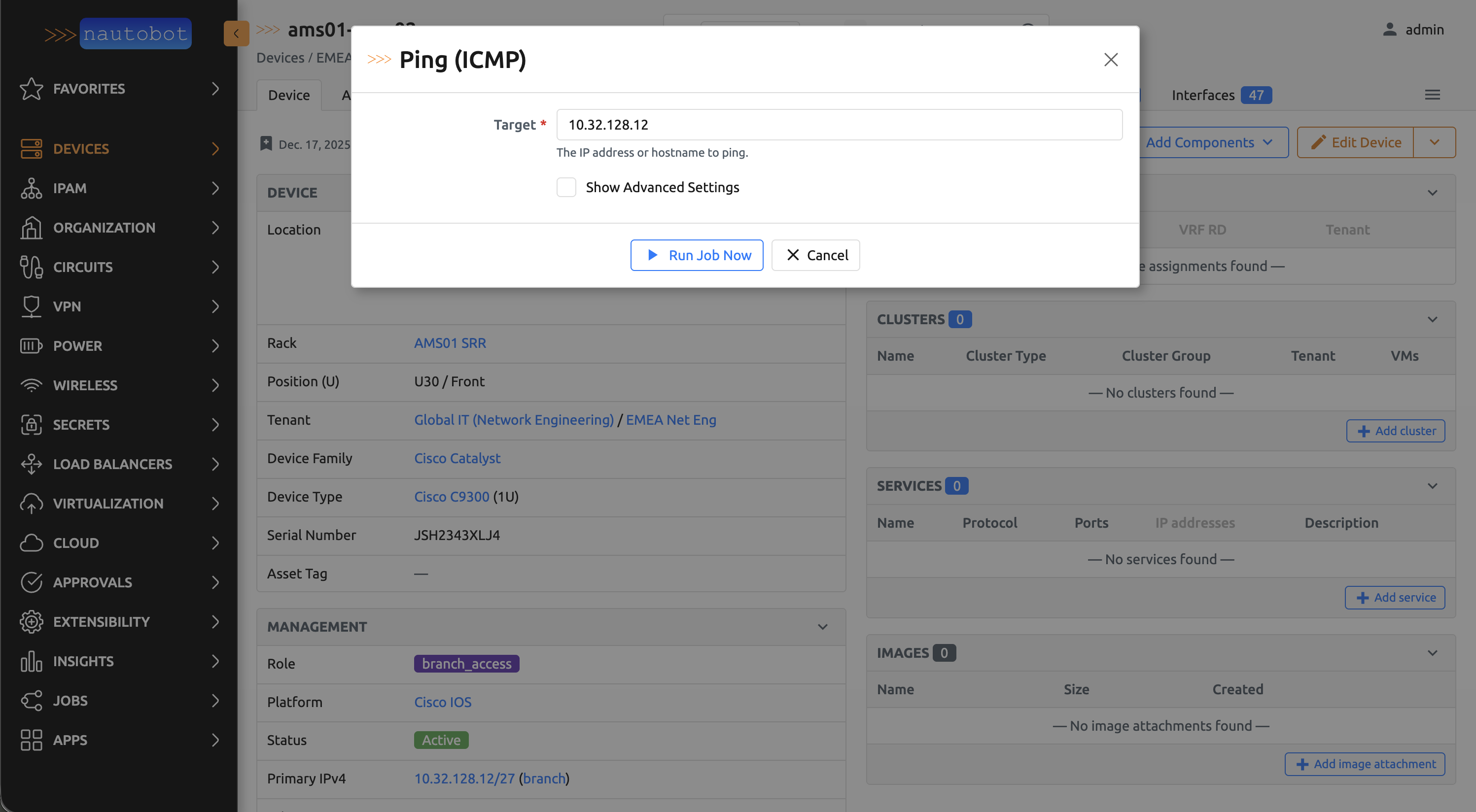ICMP tool job modal on device detail view.