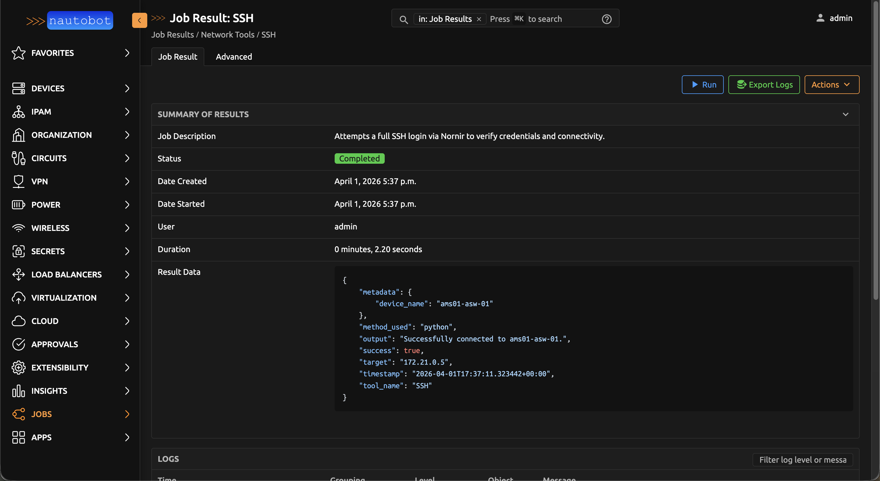 2. Can the worker reach the target? — The tools run on Nautobot worker processes, not on your local machine. The worker must have network access to the target host.